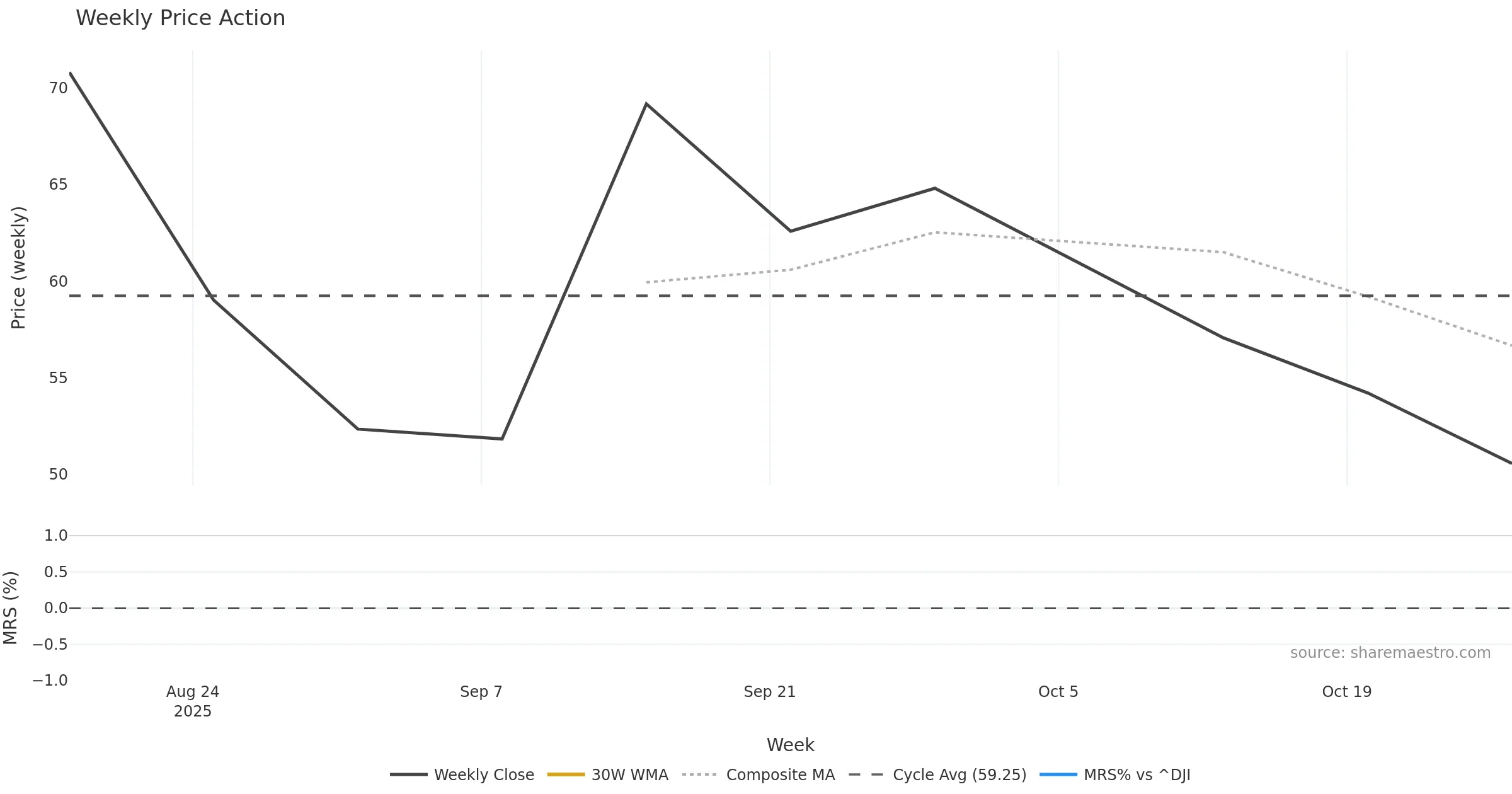 Slope -0.71% per week; 8-week change -3.40%. Up/Down 0 up / 0 down; longest down-streak 3. Context: posture above 30w & 50w, drawdown +0.00%.