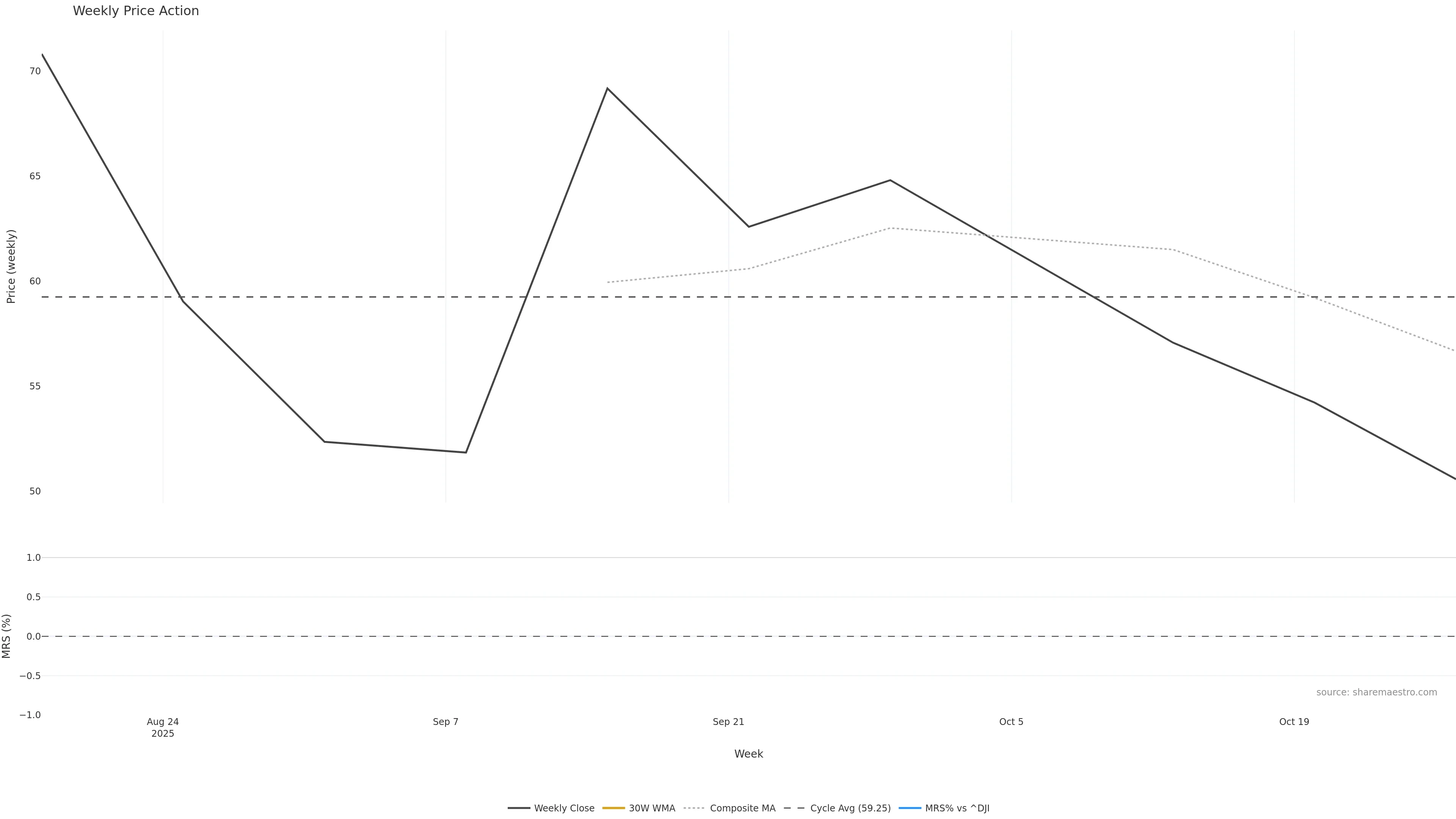 Last week closed down (-9.23%), and over the last 8 weeks price is down (-3.40%) with a falling slope (-0.714%/w). Ranges are compressing (current 0.65× mean; 25th pct; realised vol ≈ 14.32%). Price spends time in the — band (flat), participation is near typical with a balanced bias (z +0.00), money flow is flat, and posture is above 30w & 50w (drawdown 0.00%). Balance is mixed; watch participation shifts and behaviour at the 30-week average.