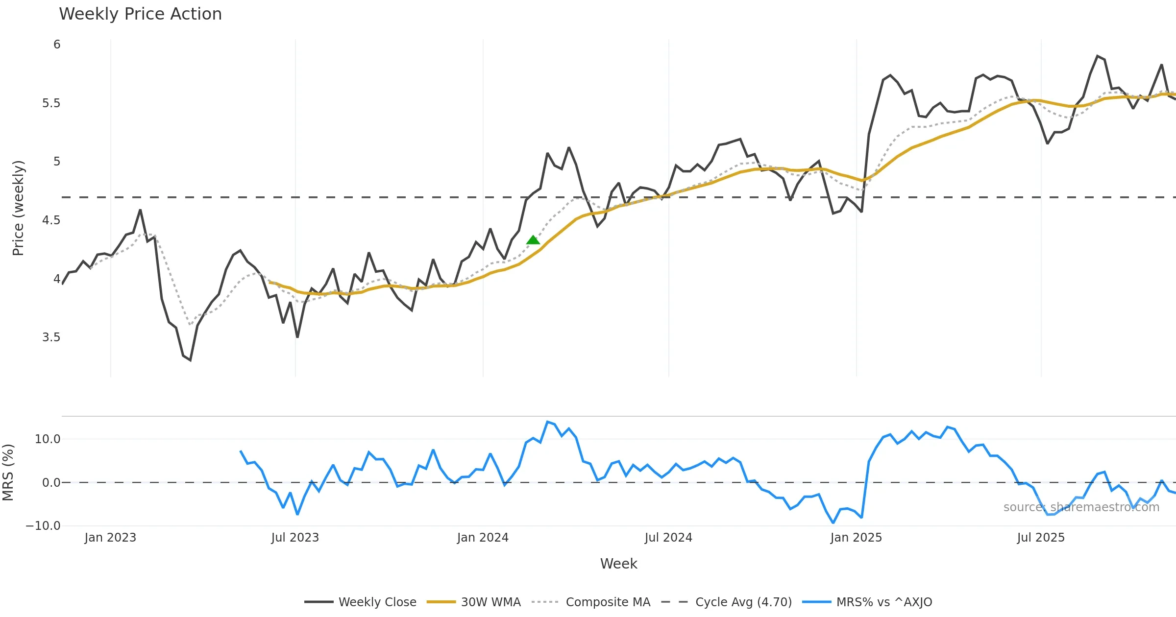 Last week closed down (-0.72%), and over the last 8 weeks price is down (-0.72%) with a rising slope (0.262%/w). Ranges are expanding (current 1.02× mean; 62th pct; realised vol ≈ 2.57%). Price spends time in the middle band (rising), participation is below typical with a selling-tilt bias (z -4.18), money flow is rising, and posture is below 30w, above 50w (drawdown -5.15%). Balance is mixed; watch participation shifts and behaviour at the 30-week average.