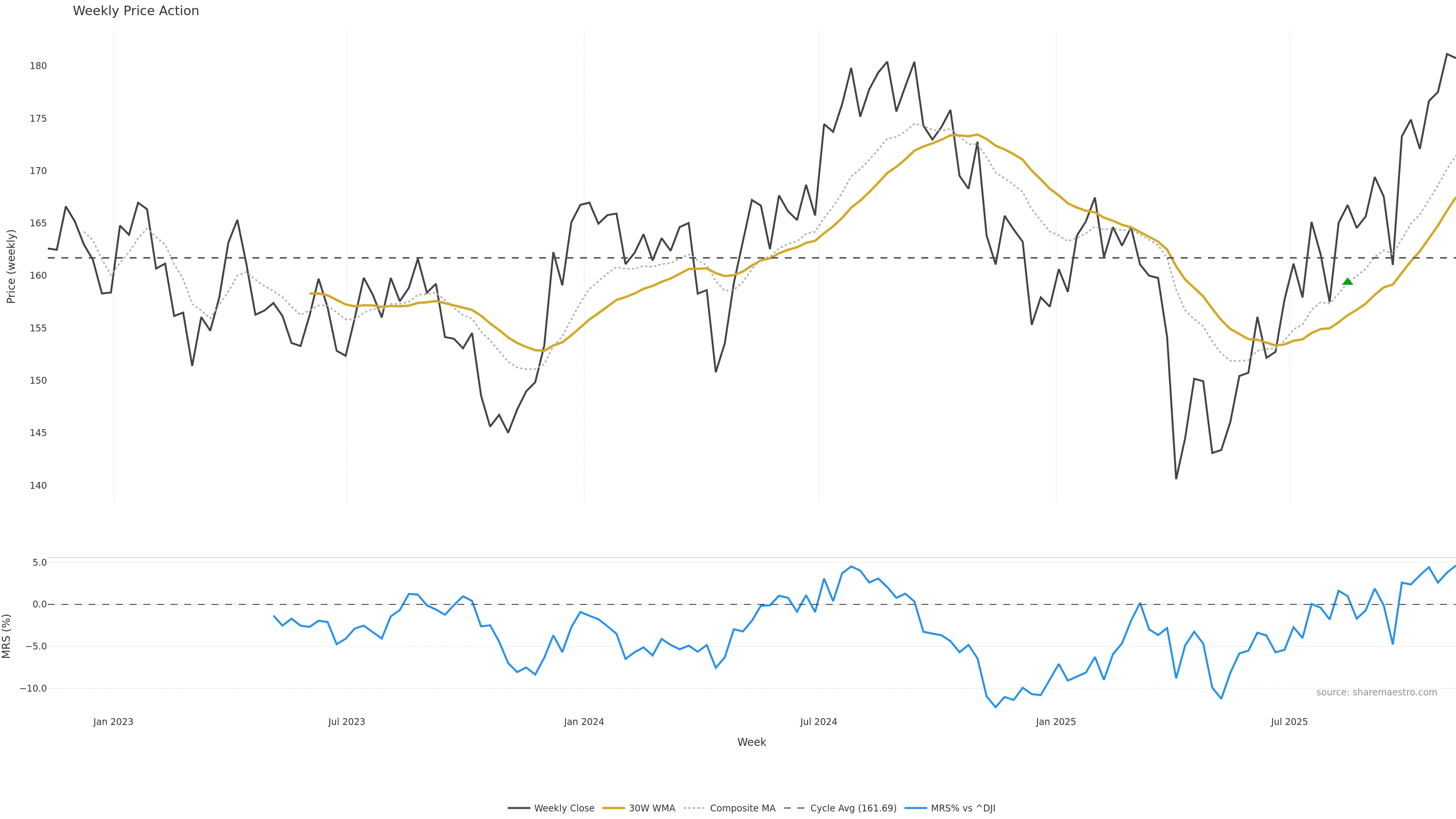 Last week closed down (-0.26%), and over the last 8 weeks price is up (12.25%) with a rising slope (1.294%/w). Ranges are compressing (current 0.59× mean; 38th pct; realised vol ≈ 2.74%). Price spends time in the upper band (rising), participation is below typical with a buying-tilt bias (z -3.41), money flow is rising, and posture is above 30w & 50w (drawdown -0.22%). Balance is mixed; watch participation shifts and behaviour at the 30-week average.