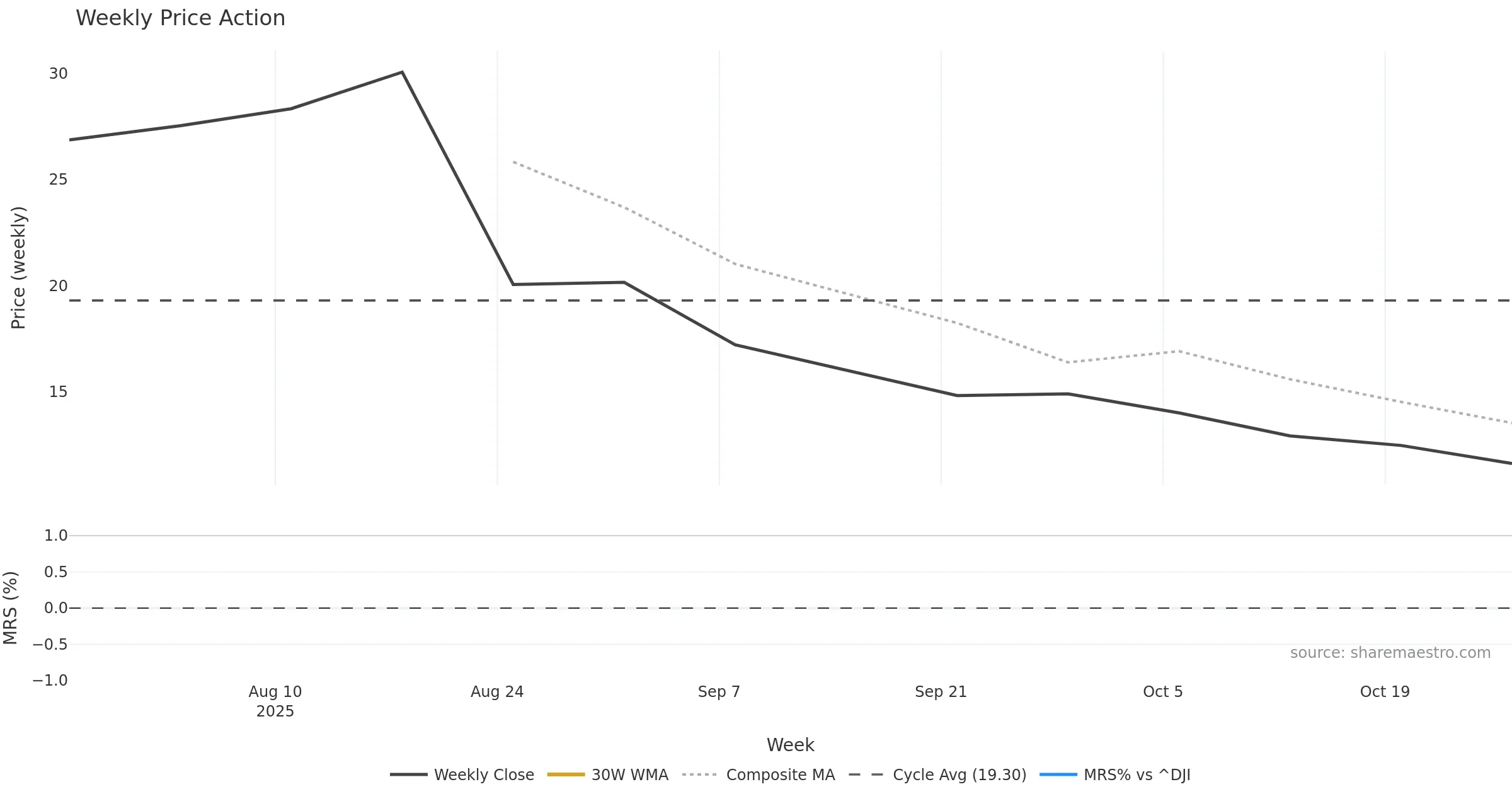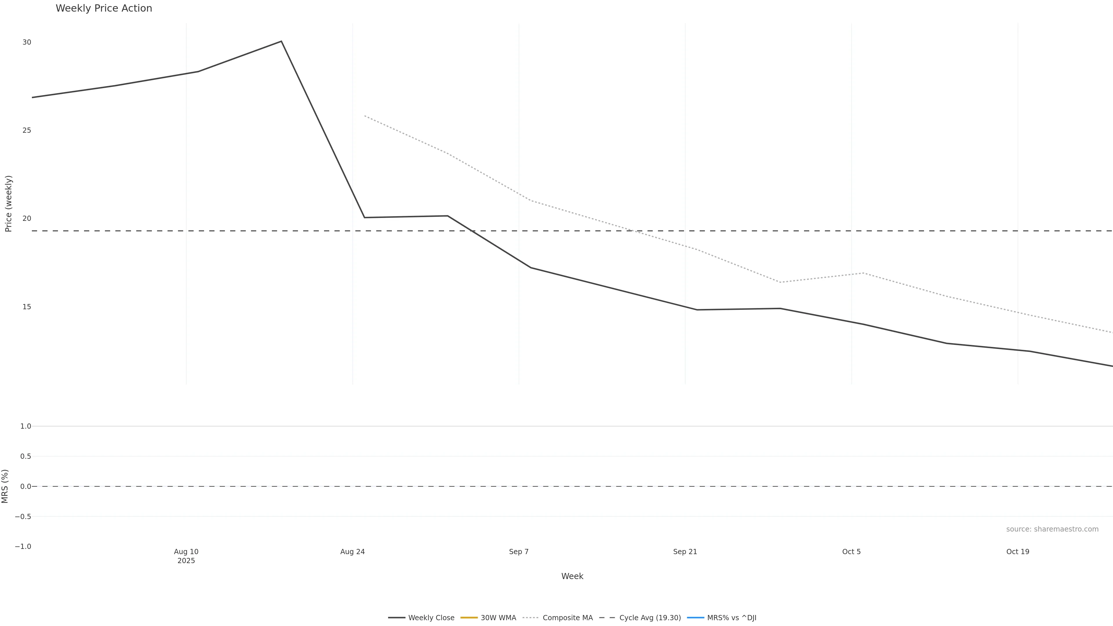 Last week closed down (-7.48%), and over the last 8 weeks price is down (-42.33%) with a falling slope (-7.259%/w). Ranges are compressing (current 0.78× mean; 25th pct; realised vol ≈ 4.99%). Price spends time in the lower band (rising), participation is below typical with a selling-tilt bias (z -3.31), money flow is falling, and posture is below 30w & 50w (drawdown -42.33%). Pressure favours further decline unless momentum repairs.