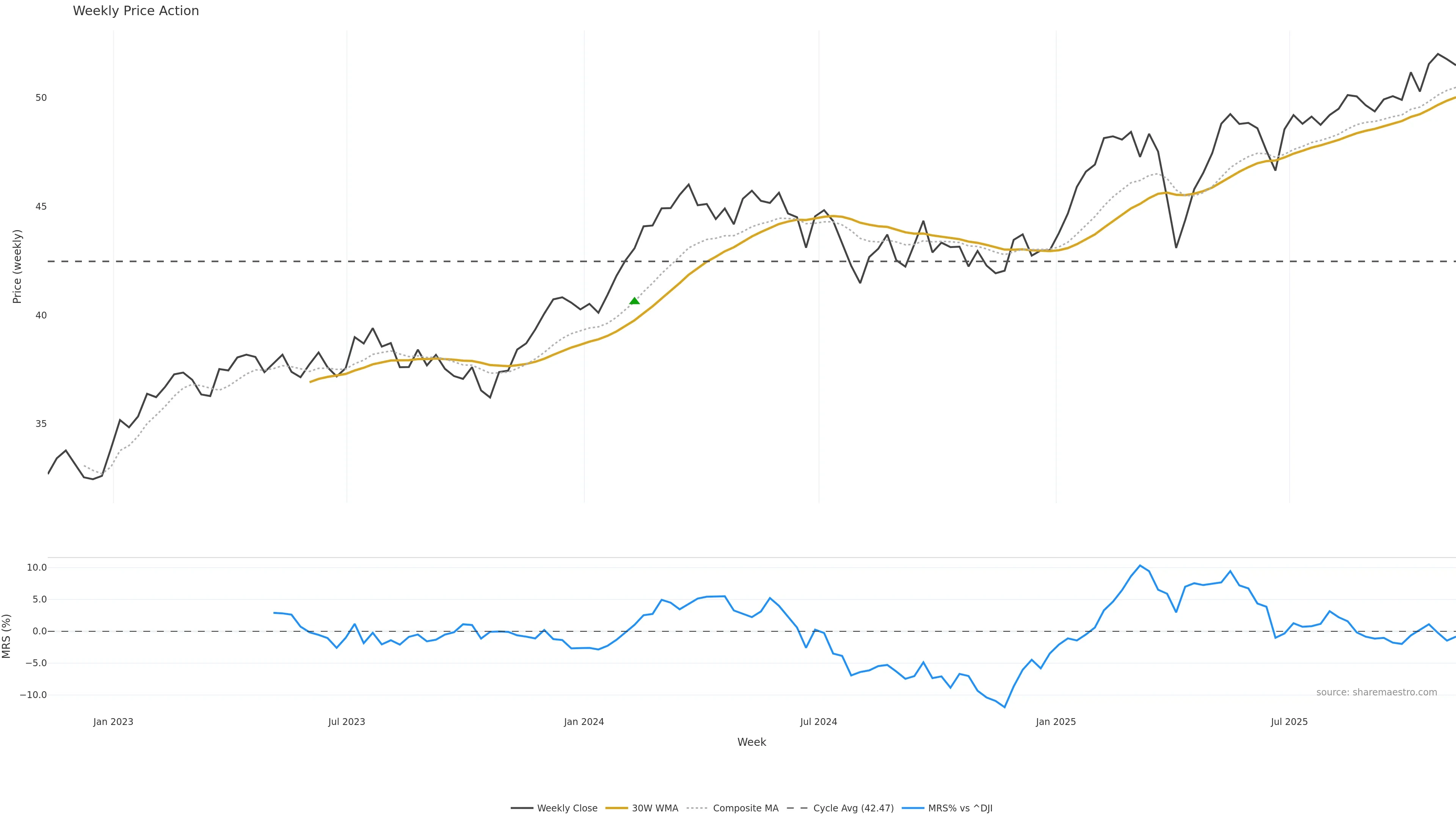 Last week closed up (0.94%), and over the last 8 weeks price is up (2.84%) with a rising slope (0.538%/w). Ranges are expanding (current 2.36× mean; 100th pct; realised vol ≈ 1.52%). Price spends time in the upper band (rising), participation is below typical with a selling-tilt bias (z -2.94), money flow is falling, and posture is above 30w & 50w (drawdown -1.00%). Balance is mixed; watch participation shifts and behaviour at the 30-week average.
