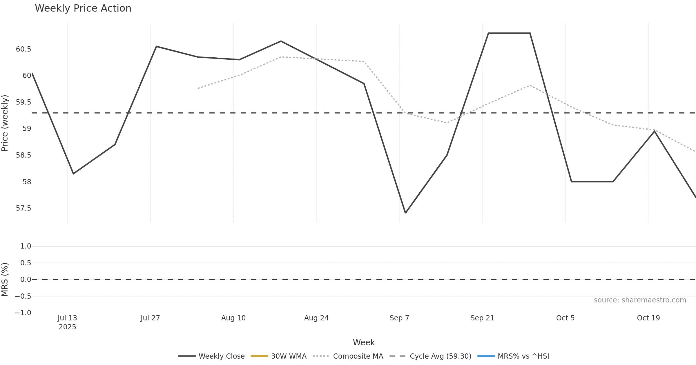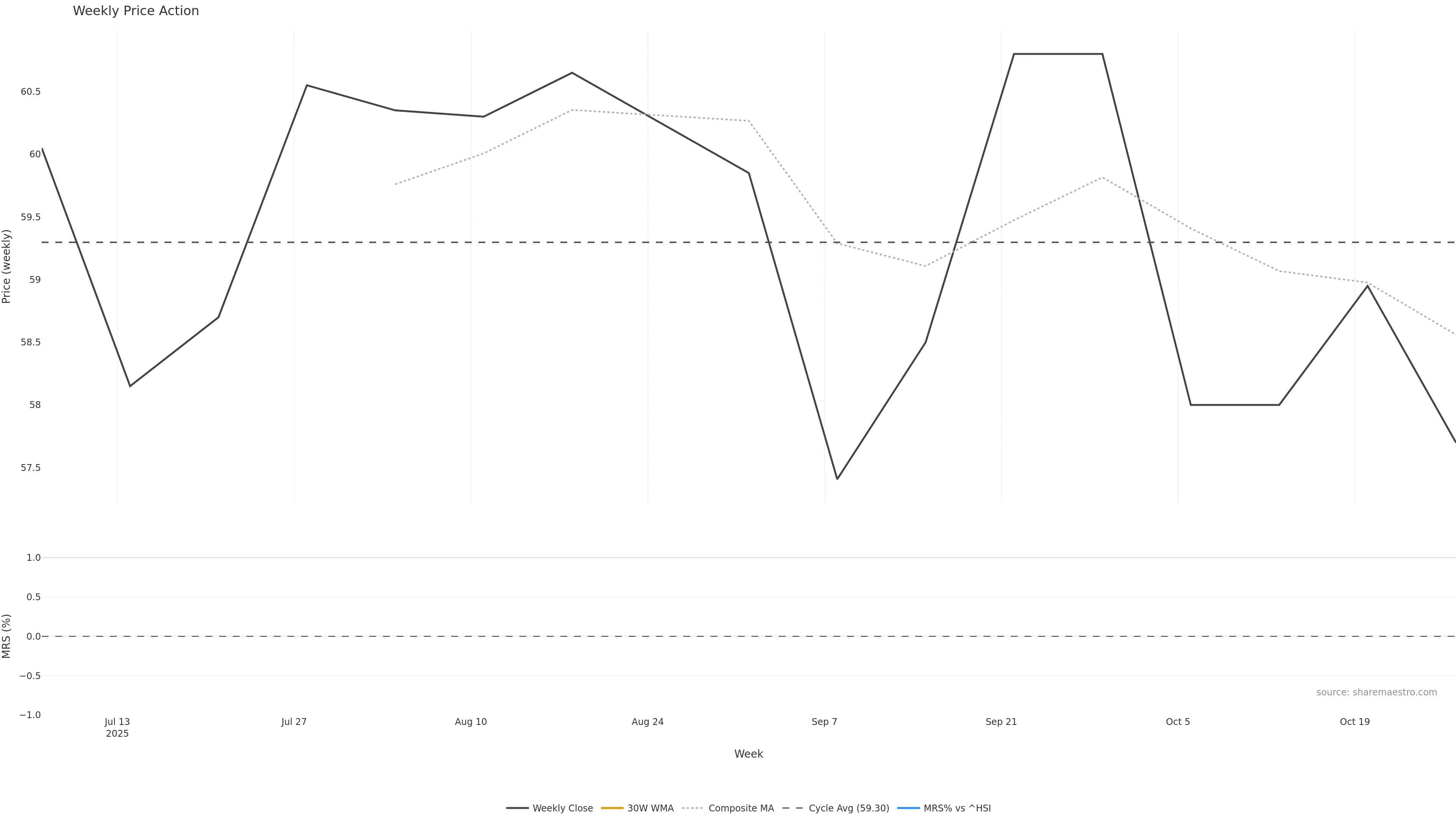 Last week closed down (-1.20%), and over the last 8 weeks price is up (0.51%) with a falling slope (-0.140%/w). Ranges are expanding (current 1.03× mean; 62th pct; realised vol ≈ 2.60%). Price spends time in the middle band (falling), participation is below typical with a buying-tilt bias (z -1.75), money flow is rising, and posture is below 30w & 50w (drawdown -5.10%). Balance is mixed; watch participation shifts and behaviour at the 30-week average.