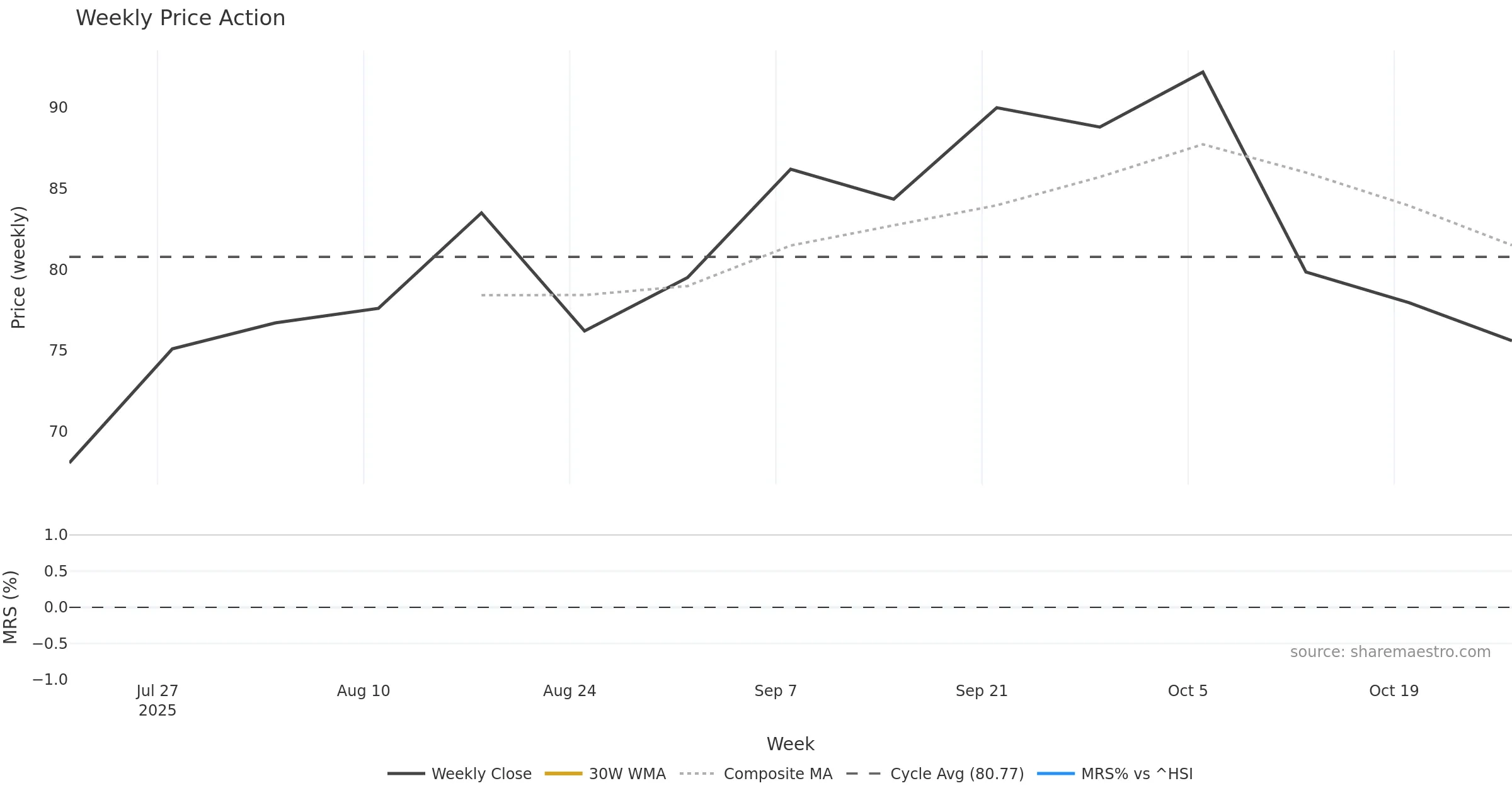 Last week closed down (-3.88%), and over the last 8 weeks price is down (-12.30%) with a falling slope (-1.880%/w). Ranges are expanding (current 1.43× mean; 88th pct; realised vol ≈ 5.86%). Price spends time in the middle band (falling), participation is below typical with a selling-tilt bias (z -0.93), money flow is falling, and posture is above 30w & 50w (drawdown -18.00%). Pressure favours further decline unless momentum repairs.