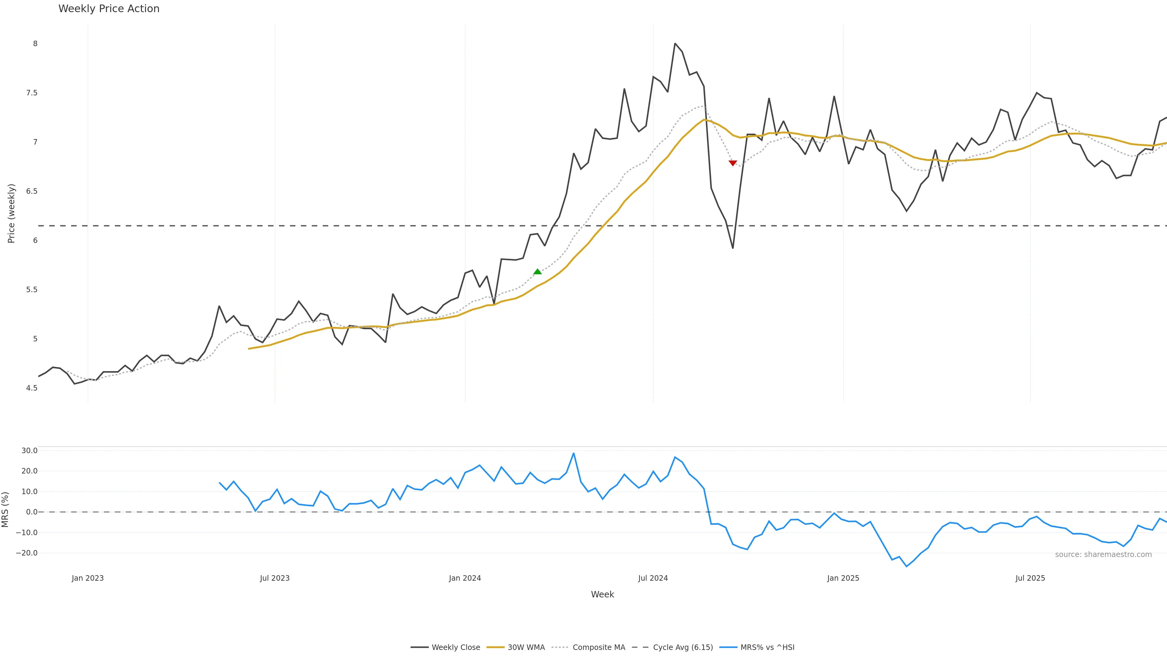 Last week closed flat (0.00%), and over the last 8 weeks price is up (9.35%) with a rising slope (1.370%/w). Ranges are expanding (current 0.67× mean; 38th pct; realised vol ≈ 1.56%). Price spends time in the upper band (rising), participation is below typical with a buying-tilt bias (z -2.64), money flow is rising, and posture is above 30w & 50w (drawdown 0.00%). Balance is mixed; watch participation shifts and behaviour at the 30-week average.