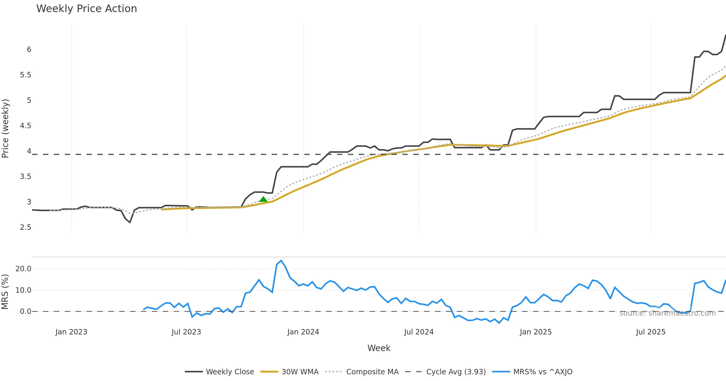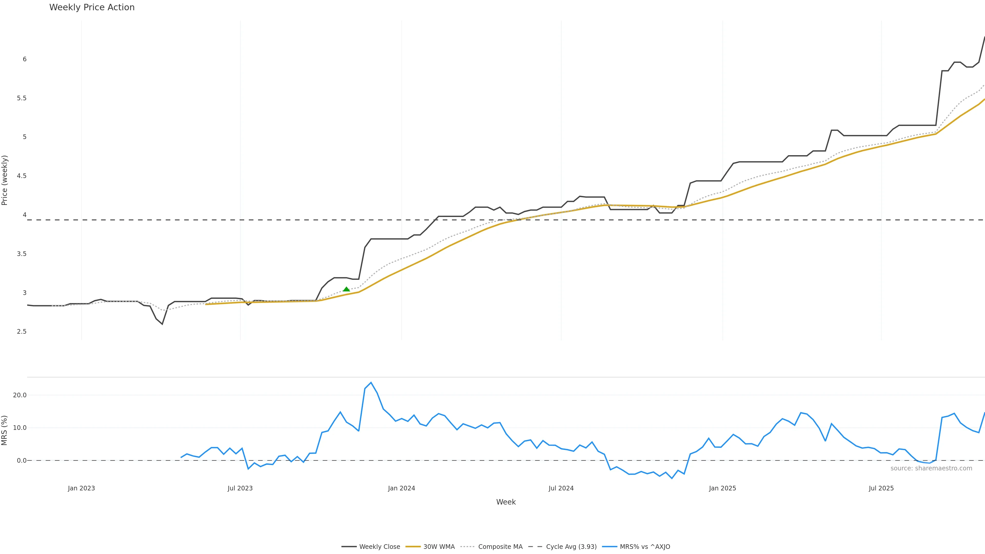 Last week closed flat (0.00%), and over the last 8 weeks price is up (7.52%) with a rising slope (0.676%/w). Ranges are stable (current 1.00× mean; 100th pct; realised vol ≈ 2.02%). Price spends time in the upper band (falling), participation is below typical with a balanced bias (z -1.89), money flow is rising, and posture is above 30w & 50w (drawdown 0.00%). Balance is mixed; watch participation shifts and behaviour at the 30-week average.