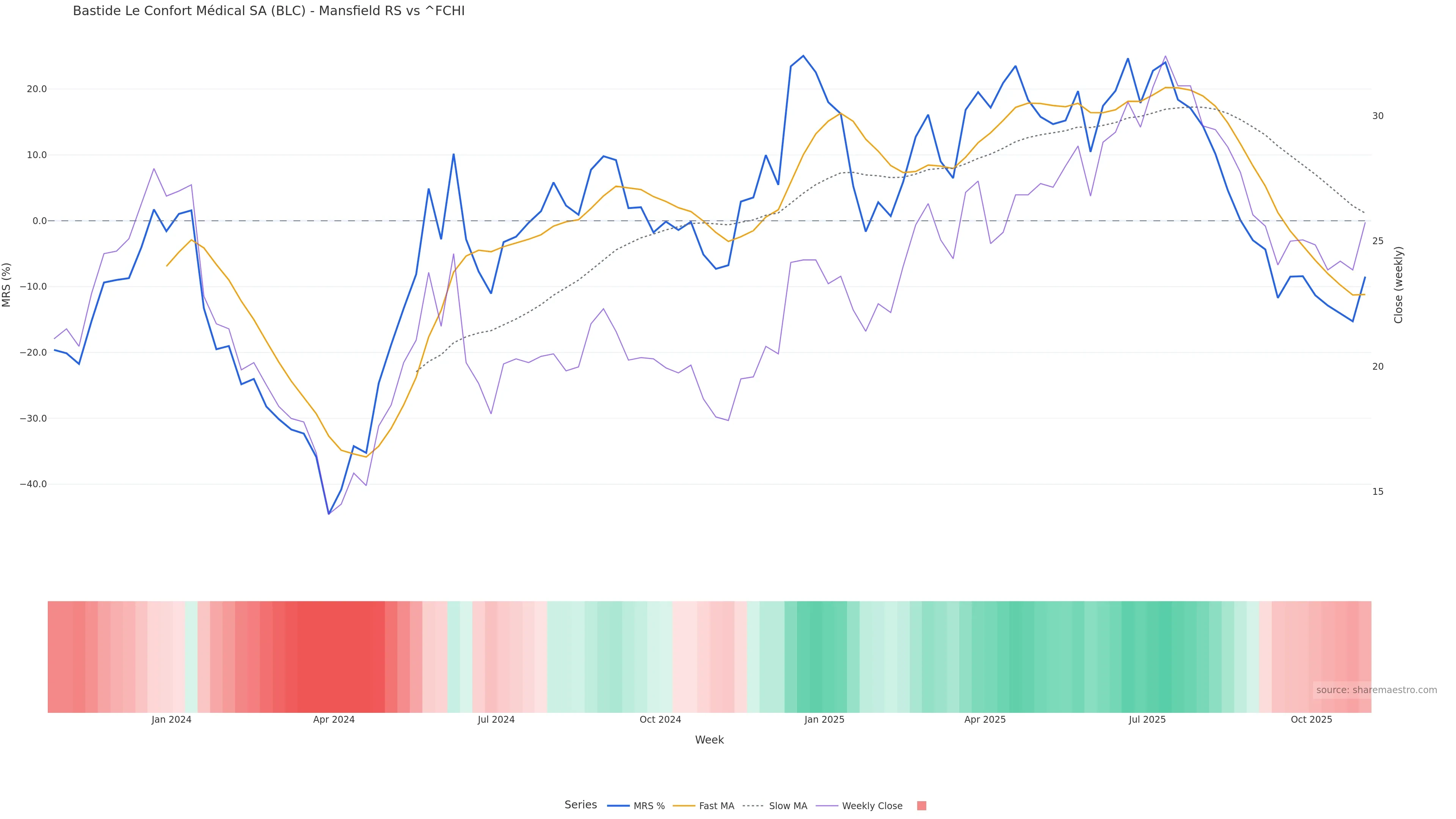 Last week closed up (3.62%), and over the last 8 weeks price is up (7.07%) with a rising slope (0.126%/w). Ranges are compressing (current 1.44× mean; 100th pct; realised vol ≈ 3.64%). Price spends time in the middle band (rising), participation is below typical with a buying-tilt bias (z -0.81), money flow is rising, and posture is below 30w & 50w (drawdown 0.00%). Balance is mixed; watch participation shifts and behaviour at the 30-week average.