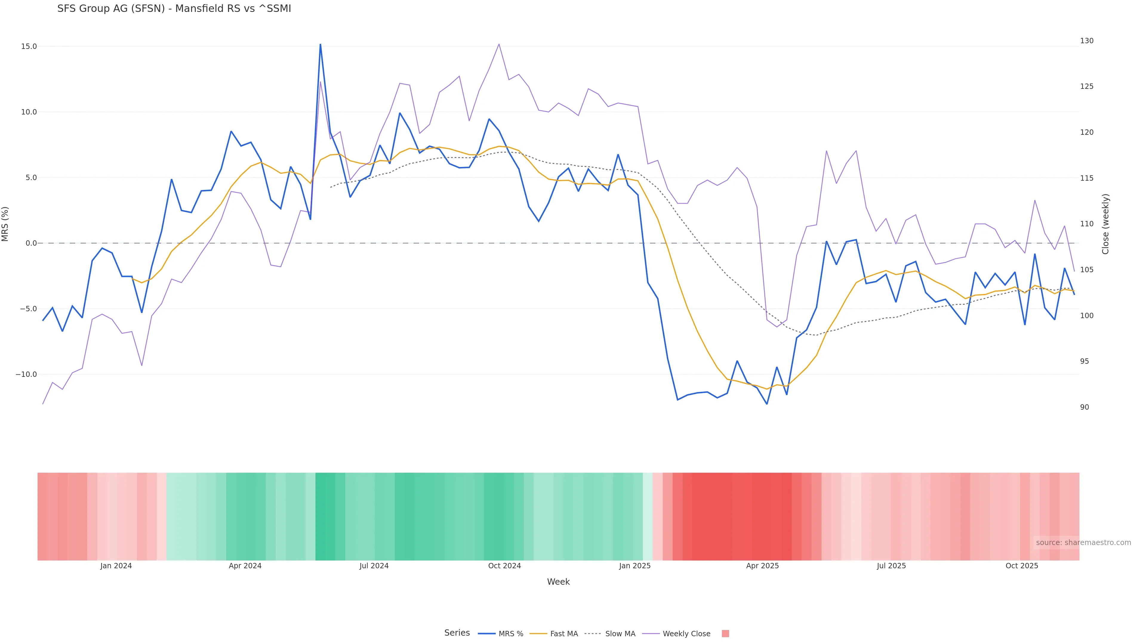 Mansfield RS vs ^SSMI is negative and weakening. Avoid unless a reversal forms. In essence this reflects Mansfield relative strength trend with a bearish tilt.