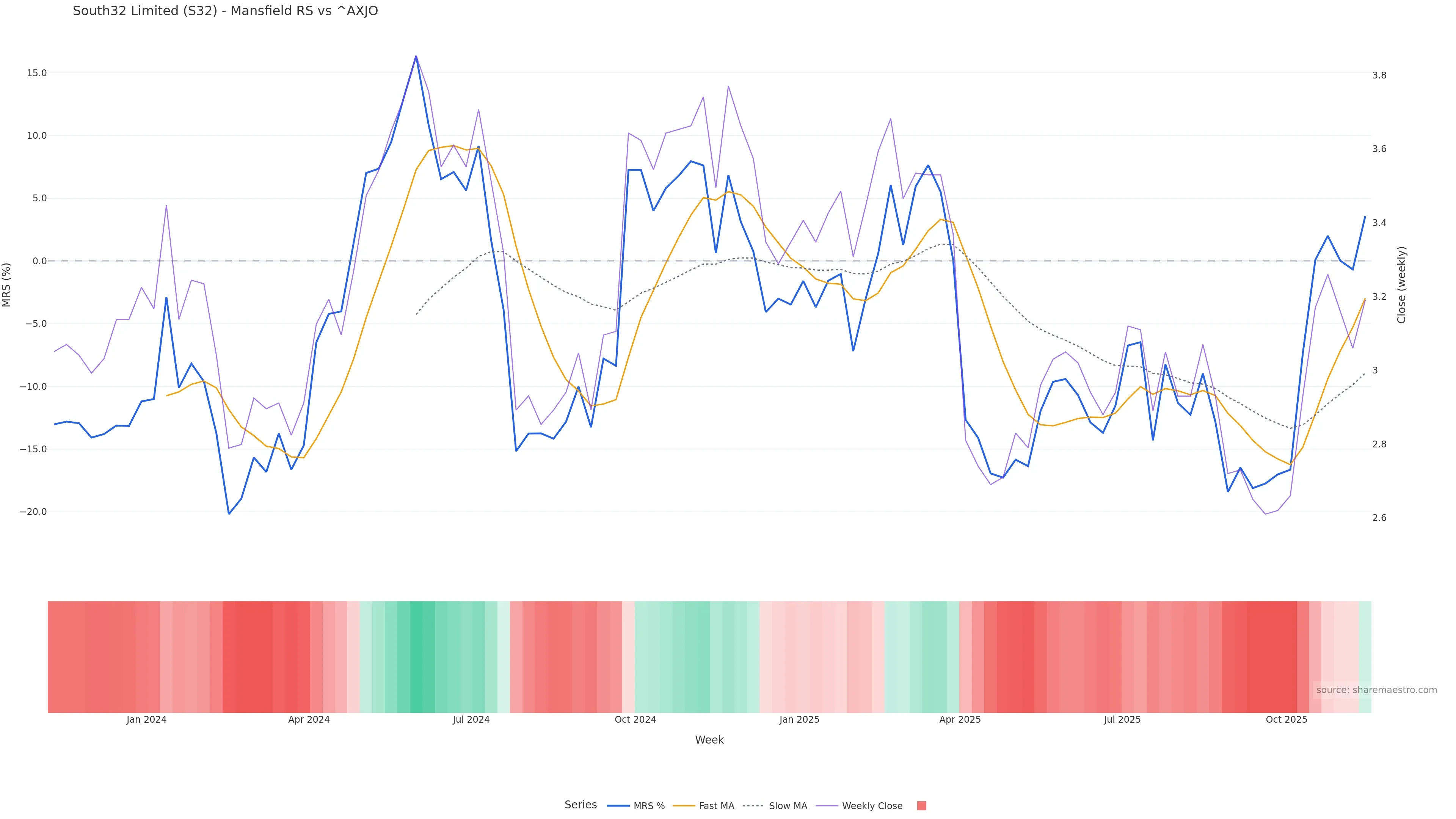 Last week closed up (2.41%), and over the last 8 weeks price is up (21.76%) with a rising slope (2.681%/w). Ranges are expanding (current 0.96× mean; 38th pct; realised vol ≈ 4.73%). Price spends time in the upper band (rising), participation is below typical with a buying-tilt bias (z -3.19), money flow is rising, and posture is above 30w & 50w (drawdown -2.15%). Balance is mixed; watch participation shifts and behaviour at the 30-week average.