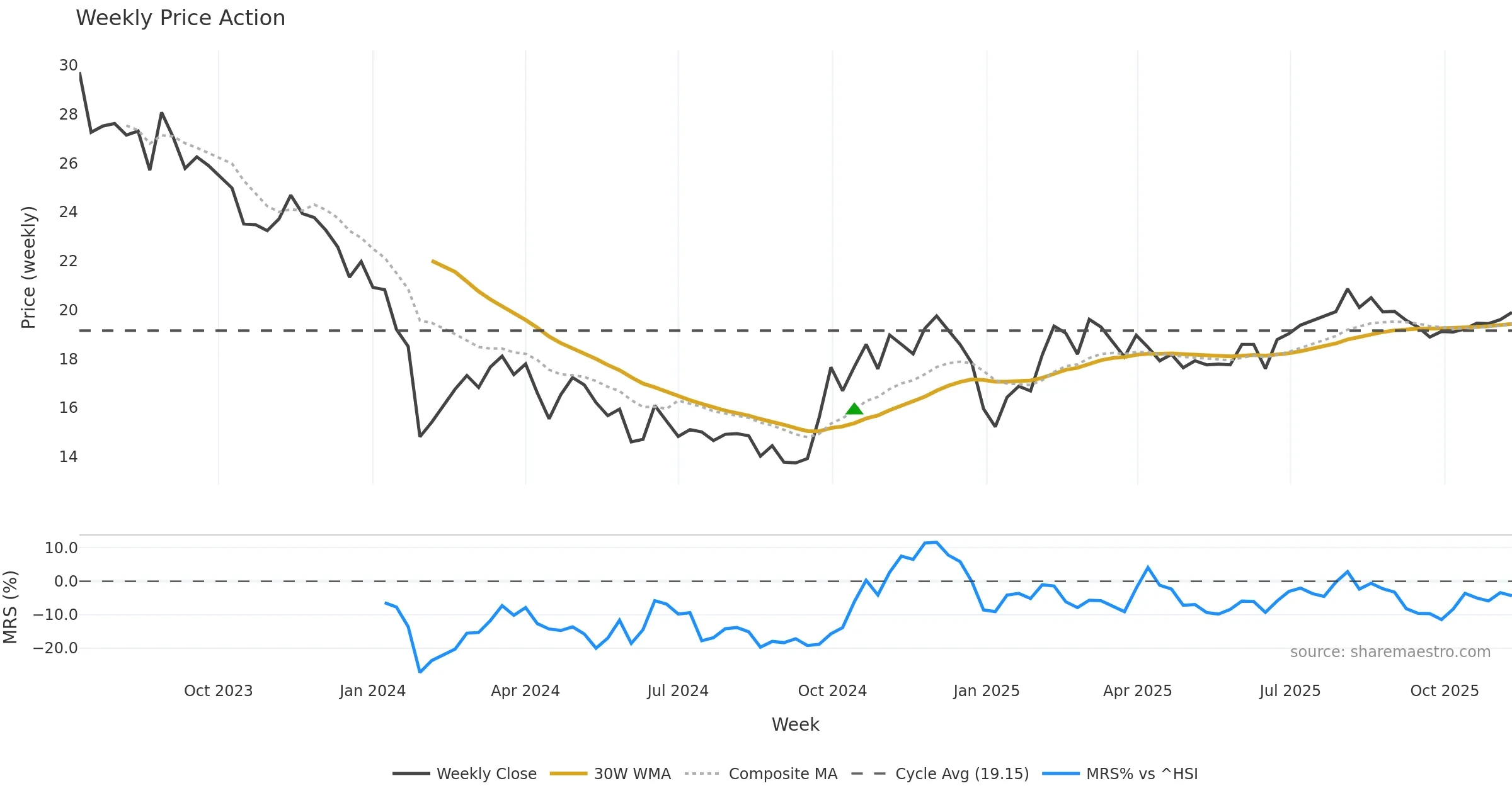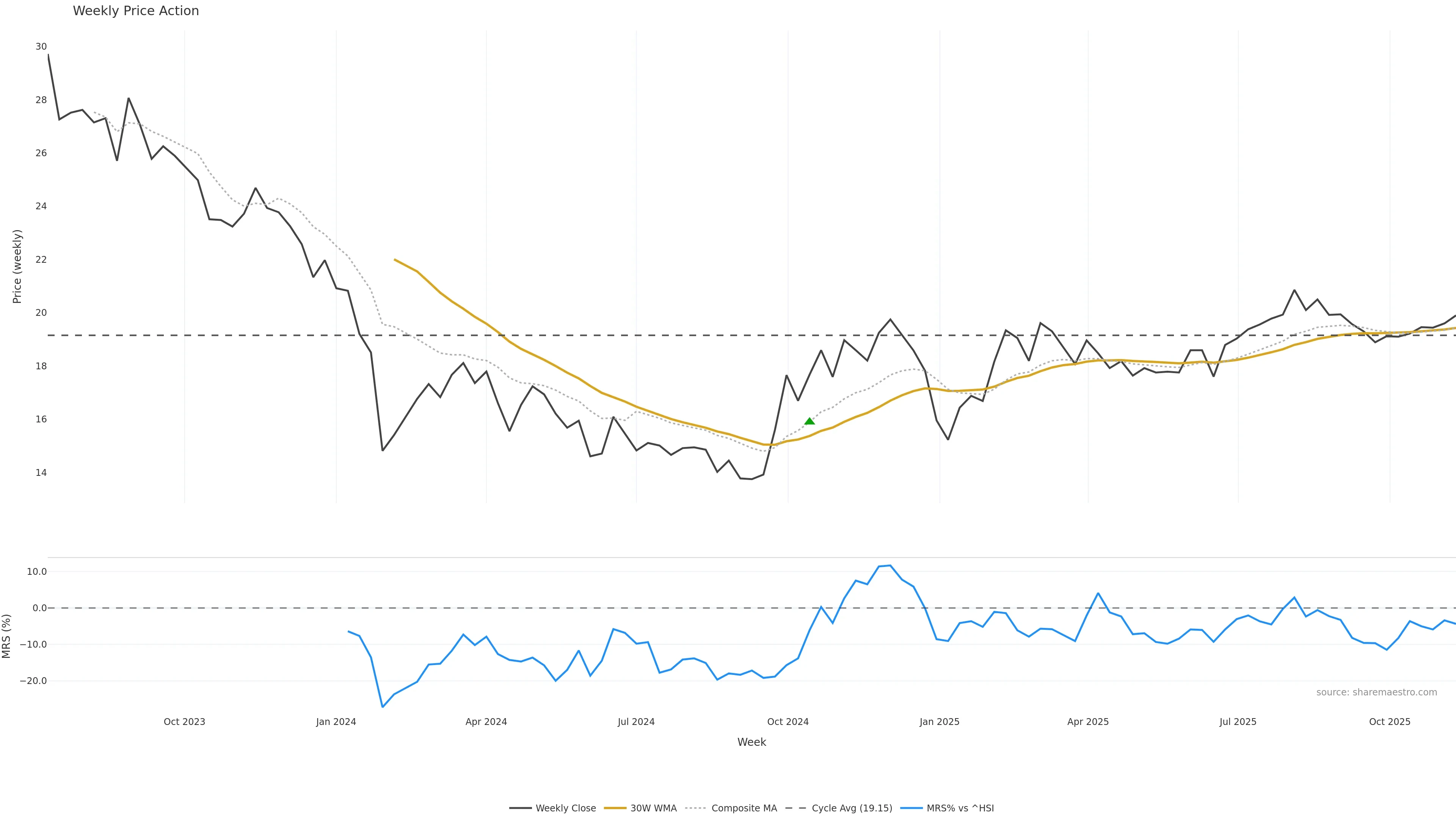 Last week closed down (-0.65%), and over the last 8 weeks price is up (5.35%) with a rising slope (0.660%/w). Ranges are compressing (current 0.71× mean; 50th pct; realised vol ≈ 0.60%). Price spends time in the middle band (rising), participation is below typical with a buying-tilt bias (z -8.80), money flow is rising, and posture is above 30w & 50w (drawdown 0.00%). Balance is mixed; watch participation shifts and behaviour at the 30-week average.