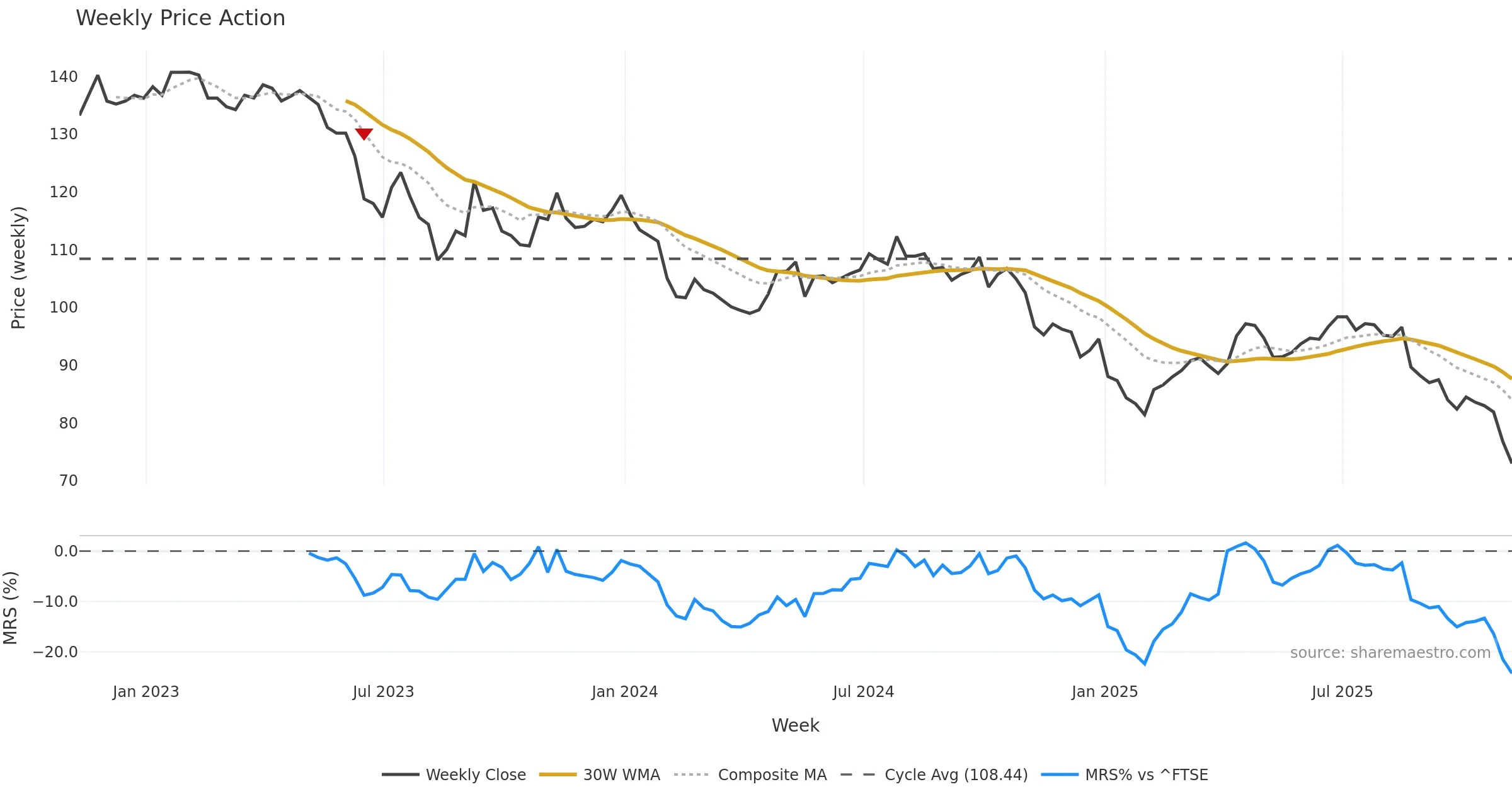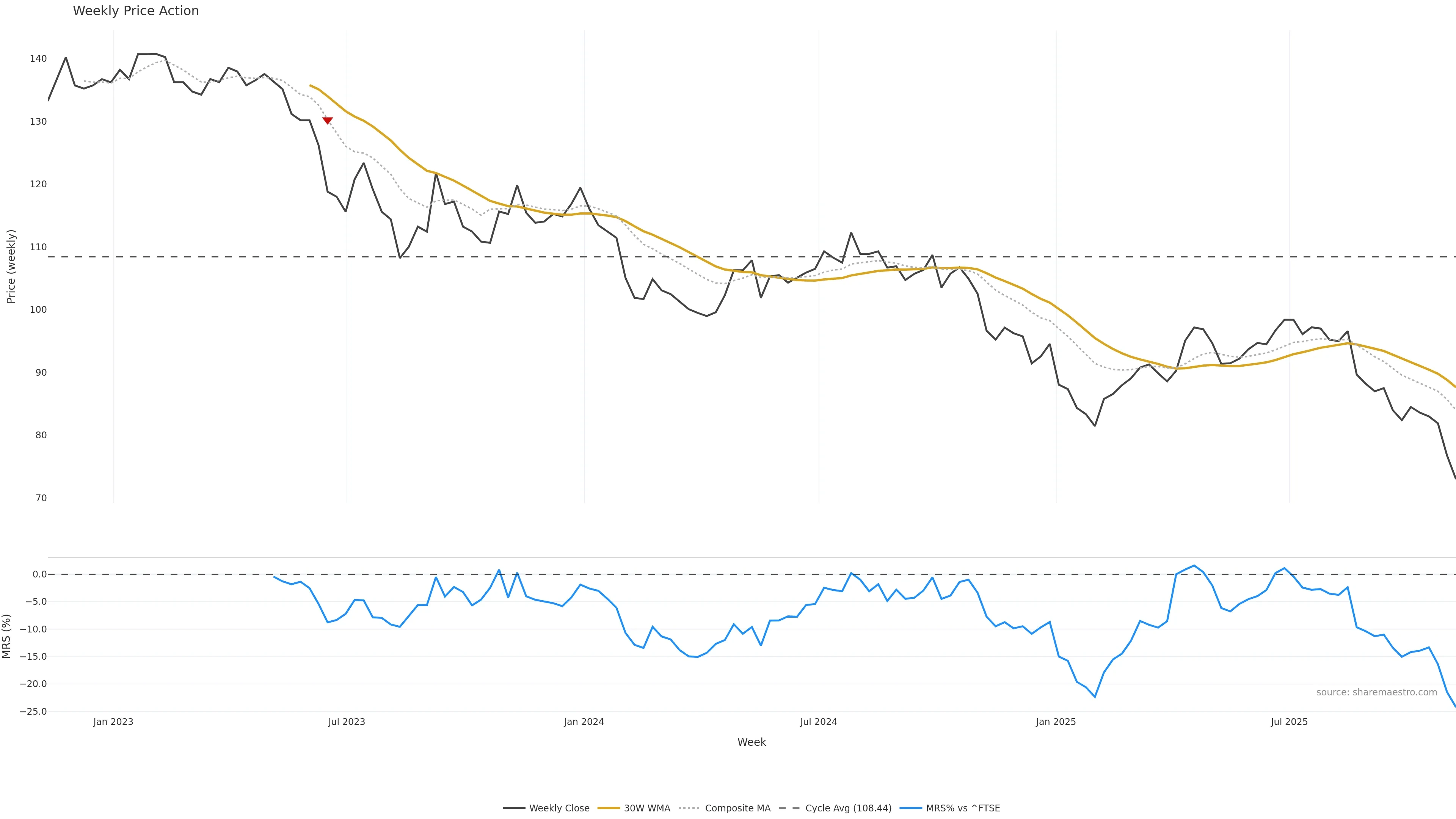 Last week closed down (-3.31%), and over the last 8 weeks price is down (-13.10%) with a falling slope (-1.664%/w). Ranges are expanding (current 1.77× mean; 100th pct; realised vol ≈ 2.68%). Price spends time in the lower band (rising), participation is below typical with a selling-tilt bias (z -1.83), money flow is falling, and posture is below 30w & 50w (drawdown -13.61%). Pressure favours further decline unless momentum repairs.