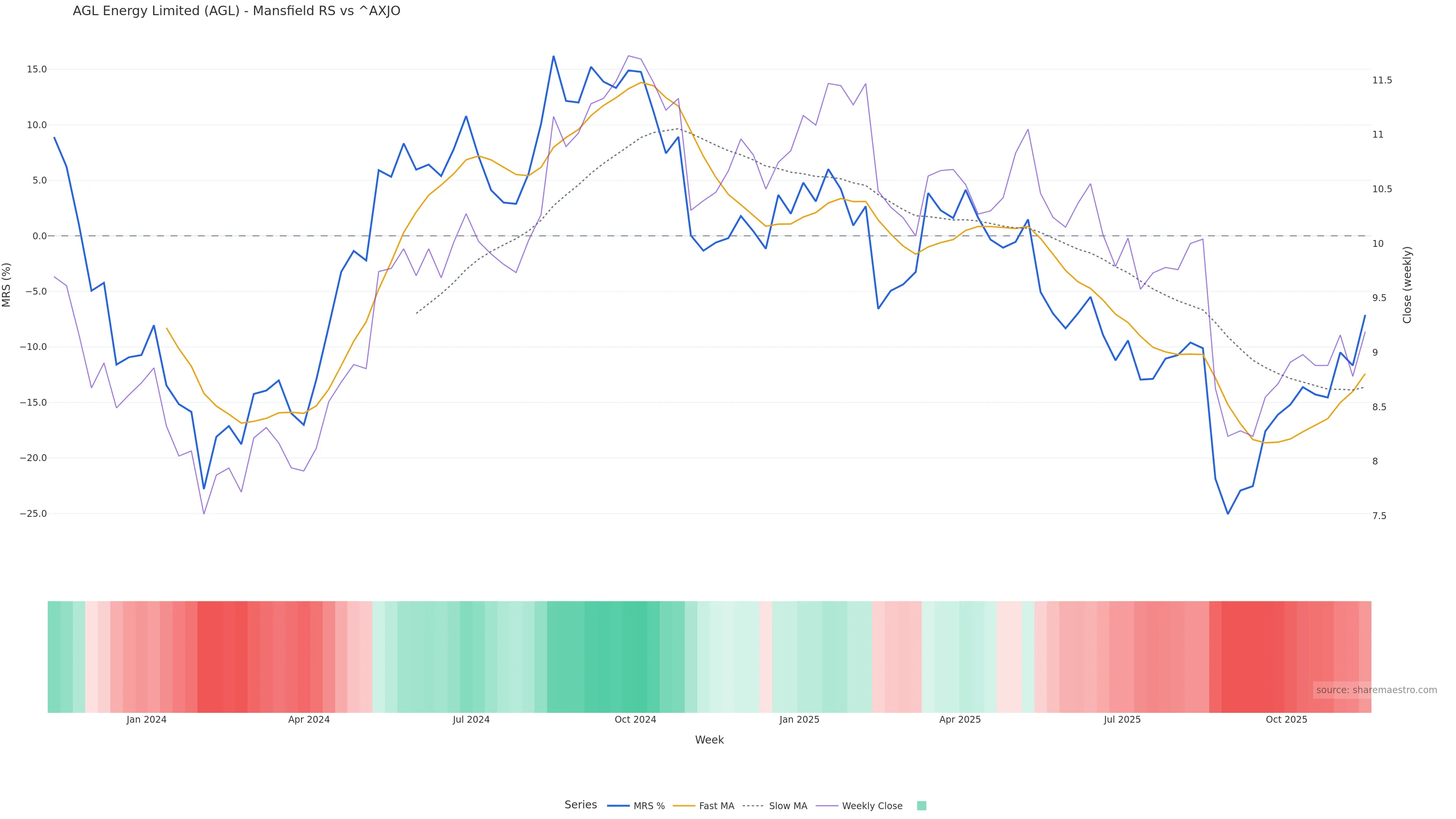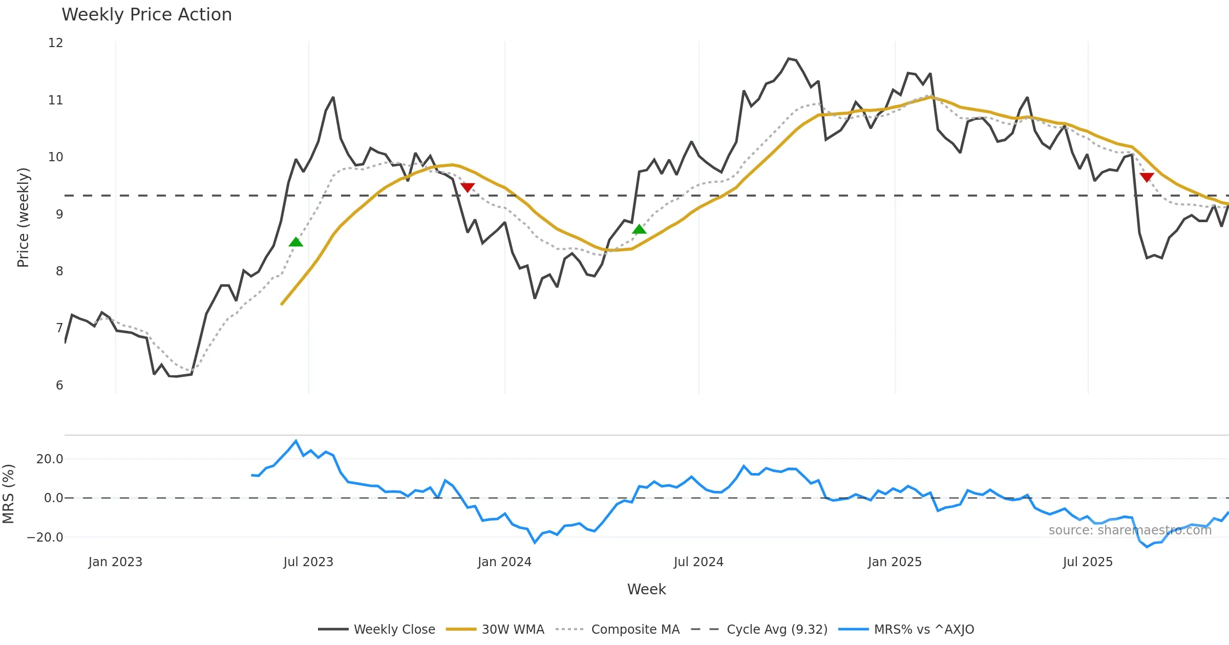 Last week closed up (1.10%), and over the last 8 weeks price is up (5.51%) with a rising slope (0.433%/w). Ranges are expanding (current 0.92× mean; 75th pct; realised vol ≈ 2.71%). Price spends time in the middle band (rising), participation is below typical with a selling-tilt bias (z -7.46), money flow is falling, and posture is below 30w & 50w (drawdown 0.00%). Balance is mixed; watch participation shifts and behaviour at the 30-week average.