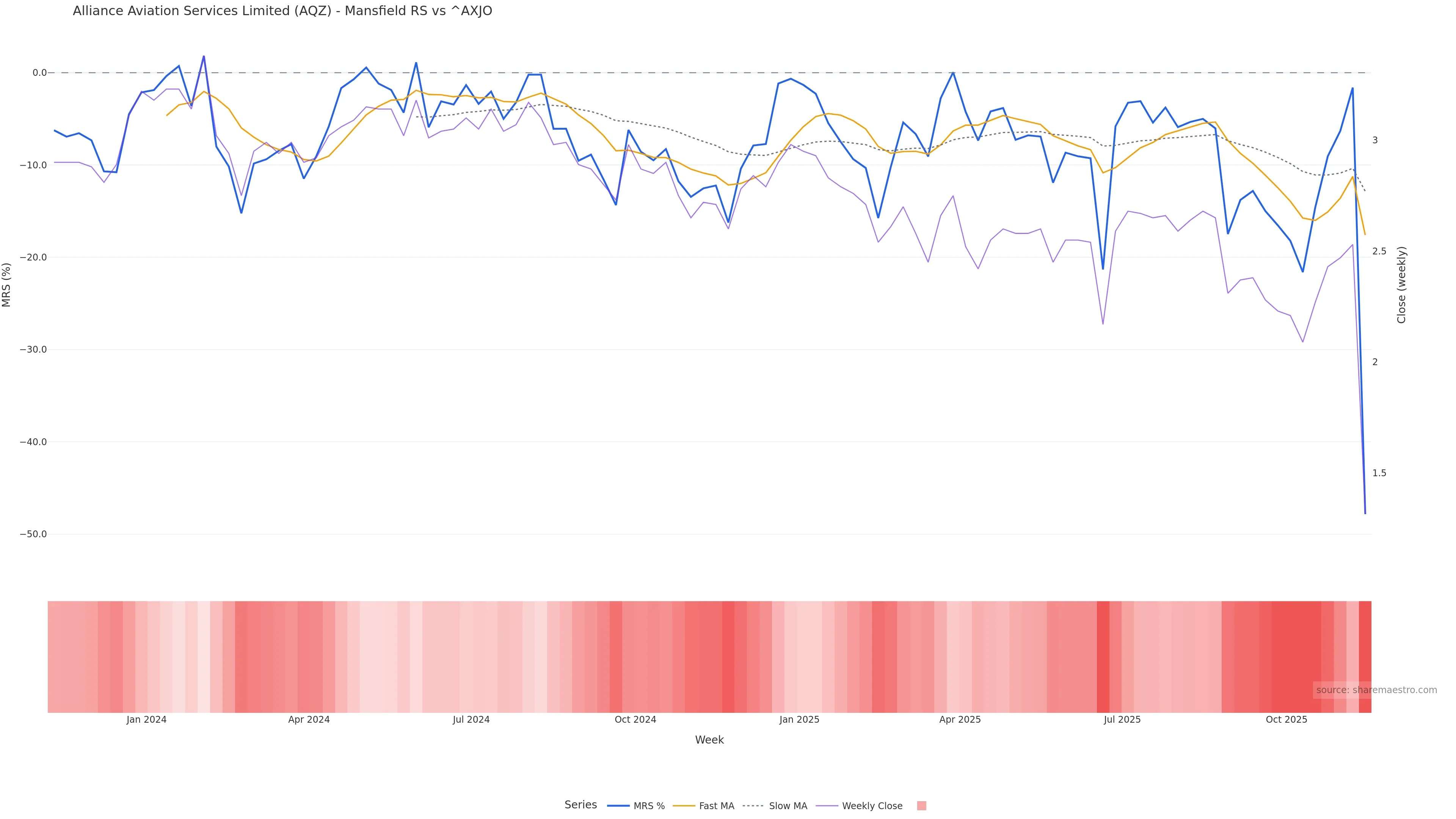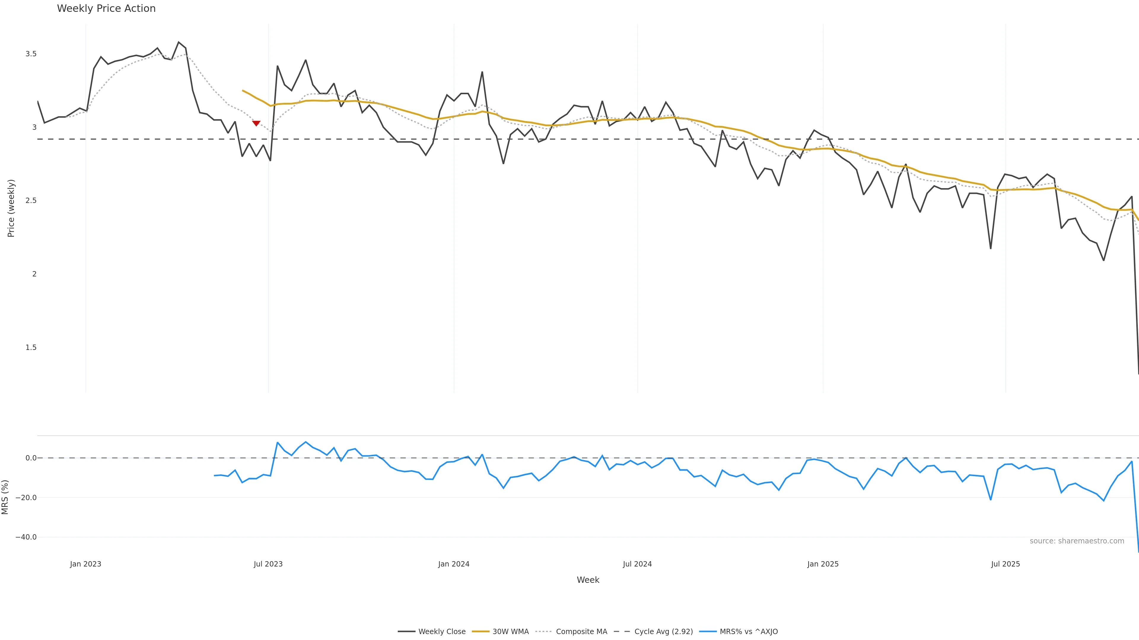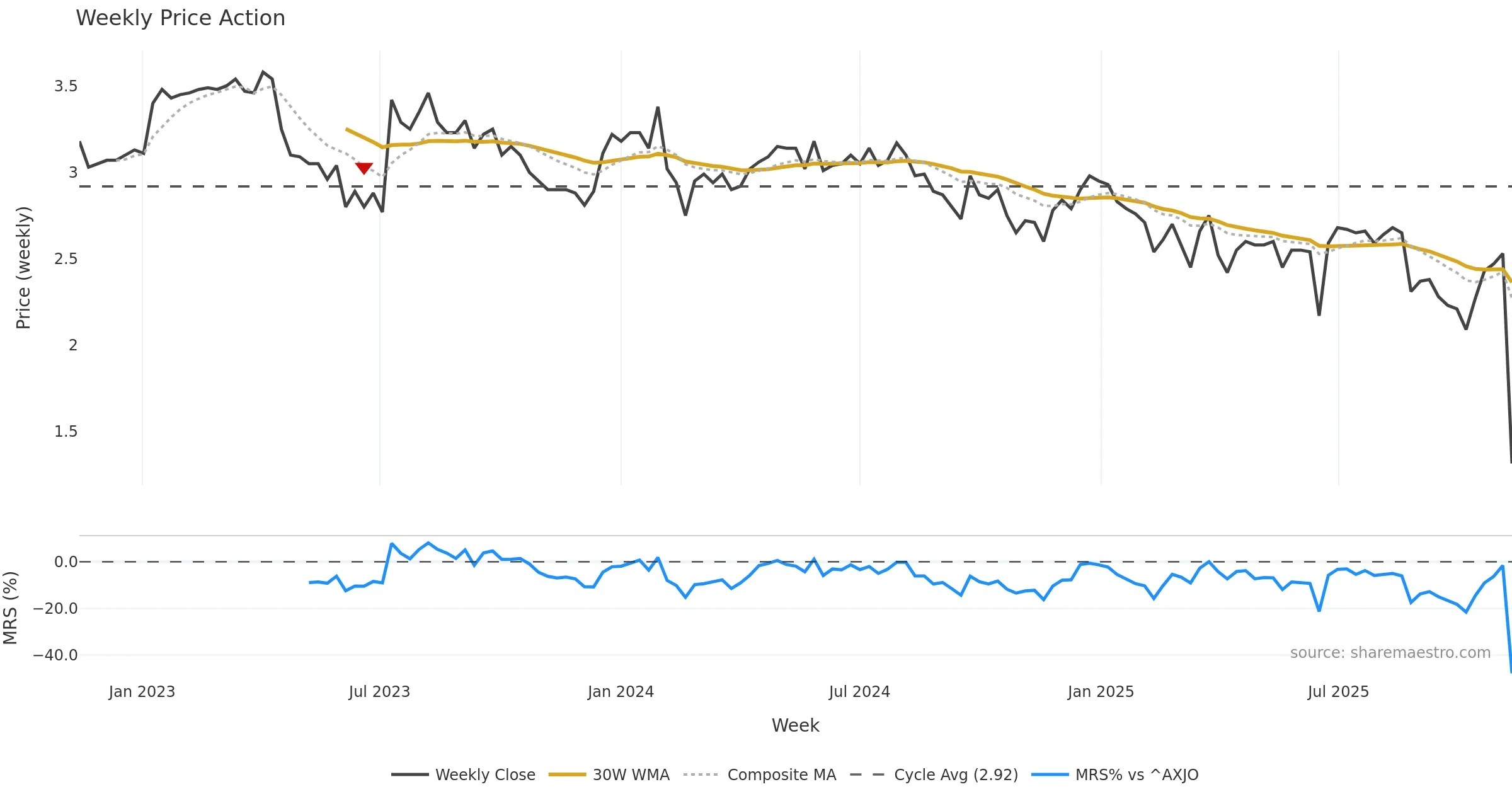 Last week closed down (-2.23%), and over the last 8 weeks price is down (-41.03%) with a falling slope (-1.903%/w). Ranges are compressing (current 0.39× mean; 25th pct; realised vol ≈ 18.12%). Price spends time in the lower band (rising), participation is above typical with a selling-tilt bias (z +46.74), money flow is rising, and posture is below 30w & 50w (drawdown -48.02%). Balance is mixed; watch participation shifts and behaviour at the 30-week average.