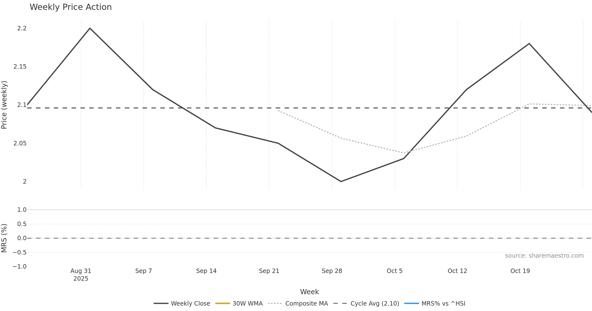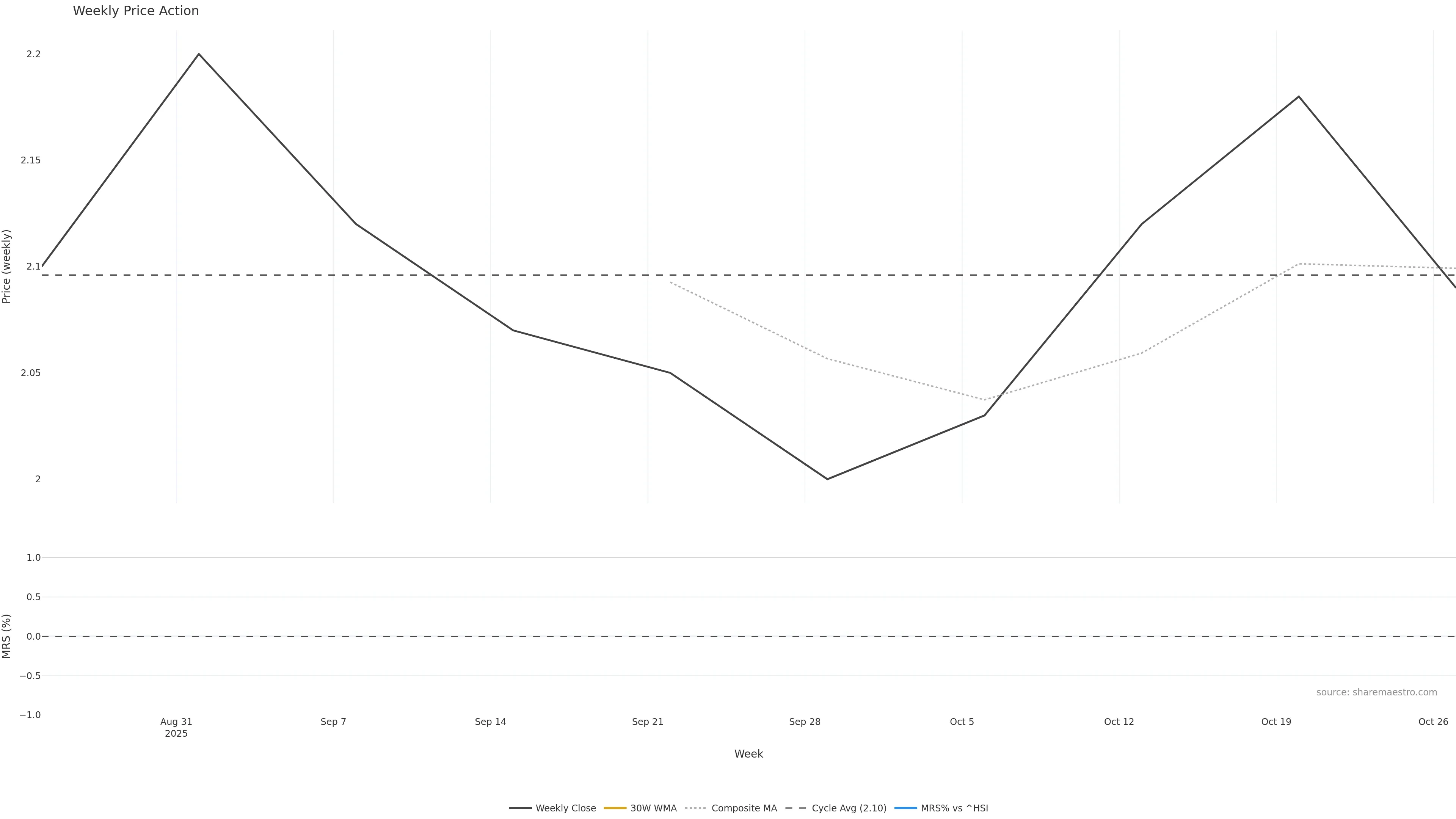 Last week closed down (-2.34%), and over the last 8 weeks price is down (-1.42%) with a rising slope (0.332%/w). Ranges are compressing (current 0.92× mean; 62th pct; realised vol ≈ 2.91%). Price spends time in the — band (flat), participation is near typical with a balanced bias (z +0.00), money flow is flat, and posture is above 30w & 50w (drawdown 0.00%). Balance is mixed; watch participation shifts and behaviour at the 30-week average.