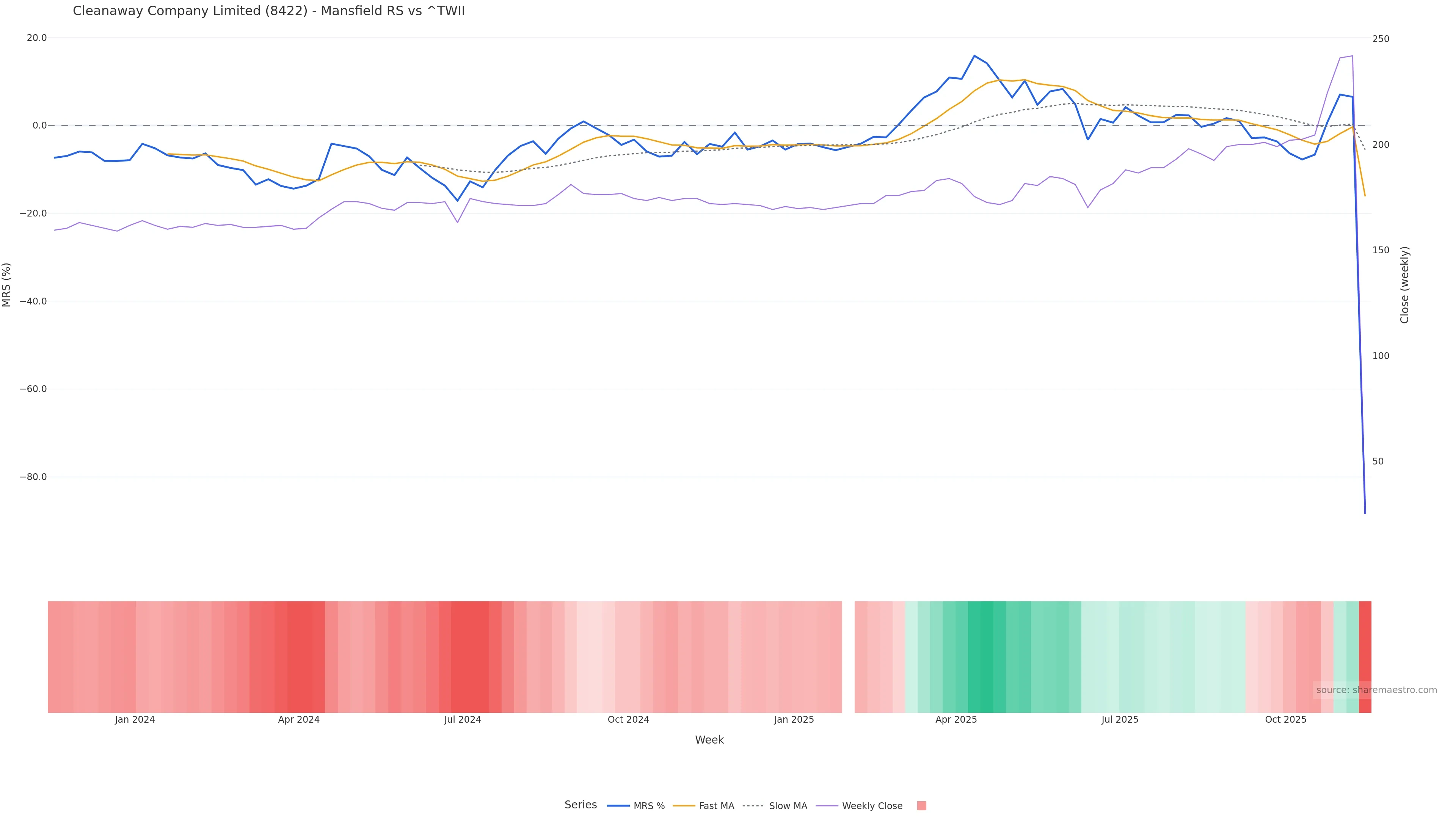 Last week closed flat (0.00%), and over the last 8 weeks price is down (-87.44%) with a falling slope (-5.456%/w). Ranges are expanding (current 0.00× mean; 12th pct; realised vol ≈ 32.75%). Price spends time in the upper band (rising), participation is below typical with a buying-tilt bias (z -7.20), money flow is rising, and posture is above 30w & 50w (drawdown -89.67%). Balance is mixed; watch participation shifts and behaviour at the 30-week average.
