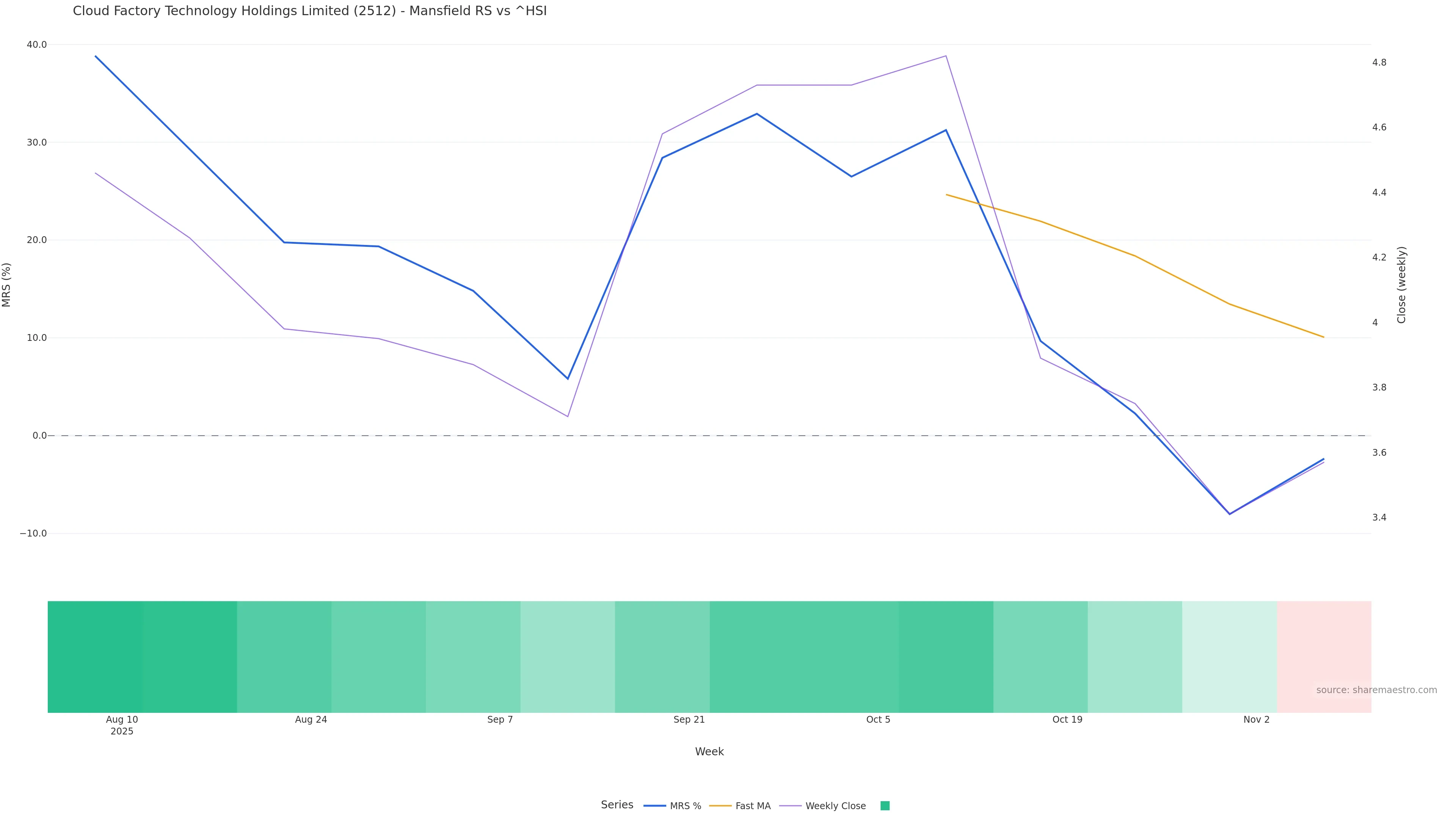 Last week closed up (5.00%), and over the last 8 weeks price is down (-22.05%) with a falling slope (-4.989%/w). Ranges are compressing (current 0.37× mean; 25th pct; realised vol ≈ 7.87%). Price spends time in the lower band (falling), participation is below typical with a buying-tilt bias (z -1.35), money flow is rising, and posture is below 30w, above 50w (drawdown -25.93%). Balance is mixed; watch participation shifts and behaviour at the 30-week average.