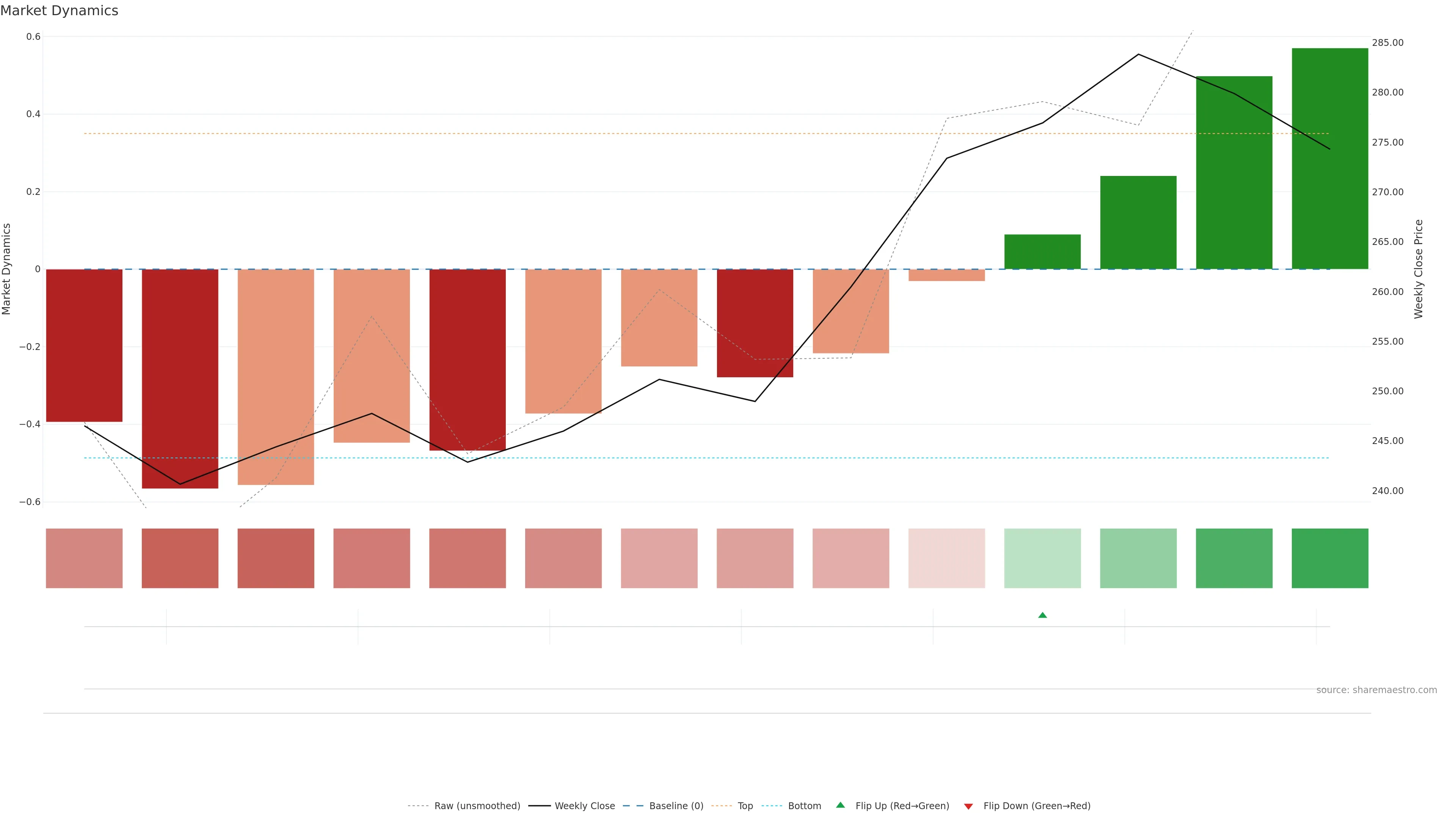 This week: market dynamics are constructive (early-trend state improving); relative strength is improving. In practical terms: backdrop leans constructive; pullbacks can be buyable if structure holds; alignment between price and intent improves reliability of advances.