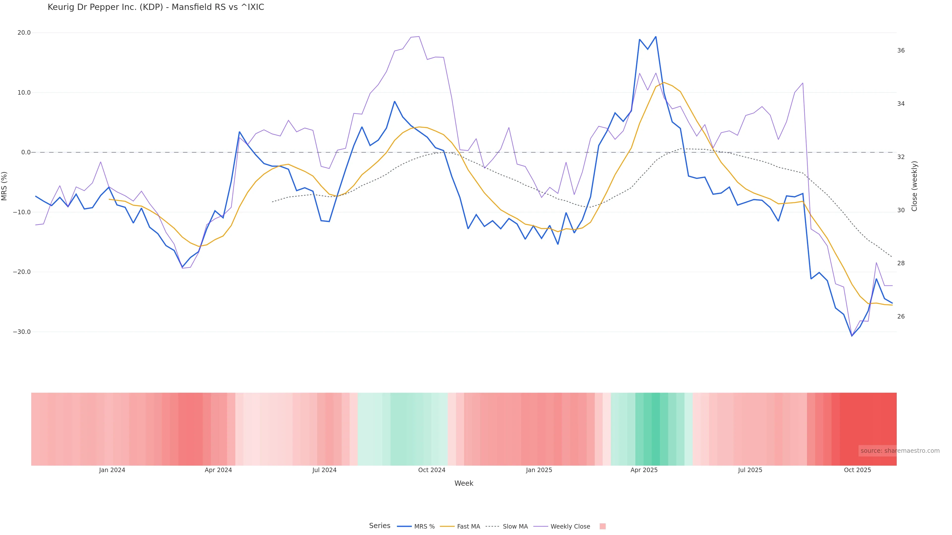 Last week closed down (-1.24%), and over the last 8 weeks price is down (-0.26%) with a rising slope (0.357%/w). Ranges are expanding (current 1.47× mean; 100th pct; realised vol ≈ 4.38%). Price spends time in the lower band (rising), participation is below typical with a selling-tilt bias (z -2.82), money flow is falling, and posture is below 30w & 50w (drawdown -3.10%). Balance is mixed; watch participation shifts and behaviour at the 30-week average.