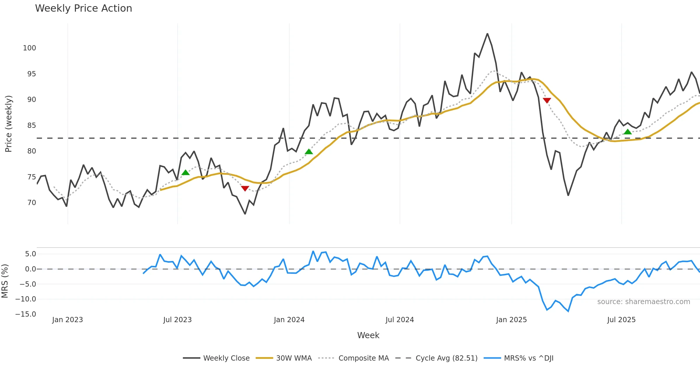 Mansfield RS vs ^DJI is negative and weakening. — Avoid unless a reversal forms.