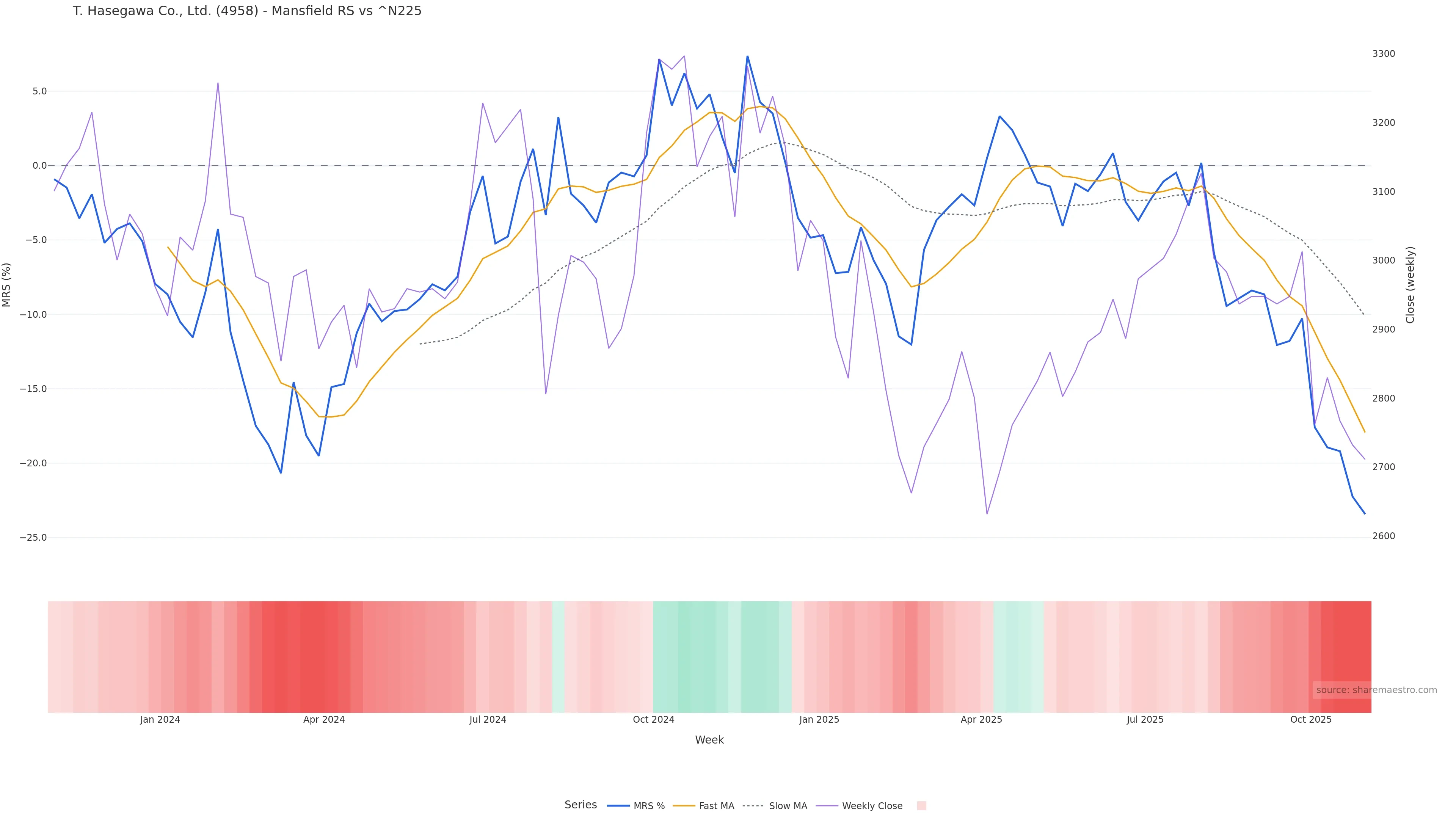 Mansfield RS vs ^N225 is negative and weakening. Avoid unless a reversal forms. In essence this reflects Mansfield relative strength trend with a bearish tilt.