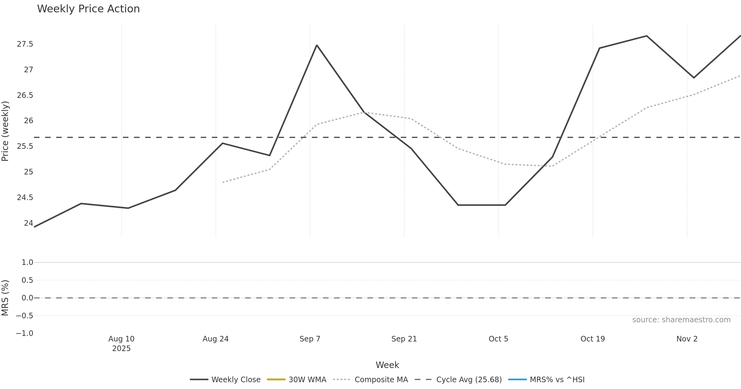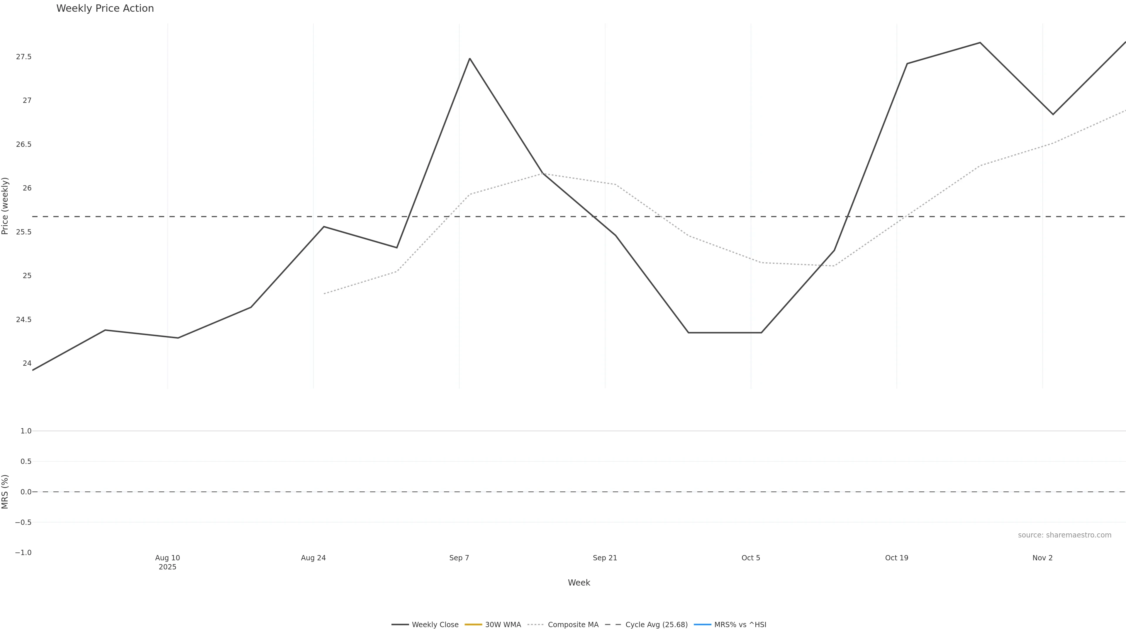 Last week closed up (2.82%), and over the last 8 weeks price is up (8.68%) with a rising slope (1.821%/w). Ranges are expanding (current 1.81× mean; 88th pct; realised vol ≈ 4.01%). Price spends time in the upper band (rising), participation is near typical with a buying-tilt bias (z +0.32), money flow is rising, and posture is above 30w & 50w (drawdown 0.00%). Follow-through favours advance if pullbacks remain shallow.