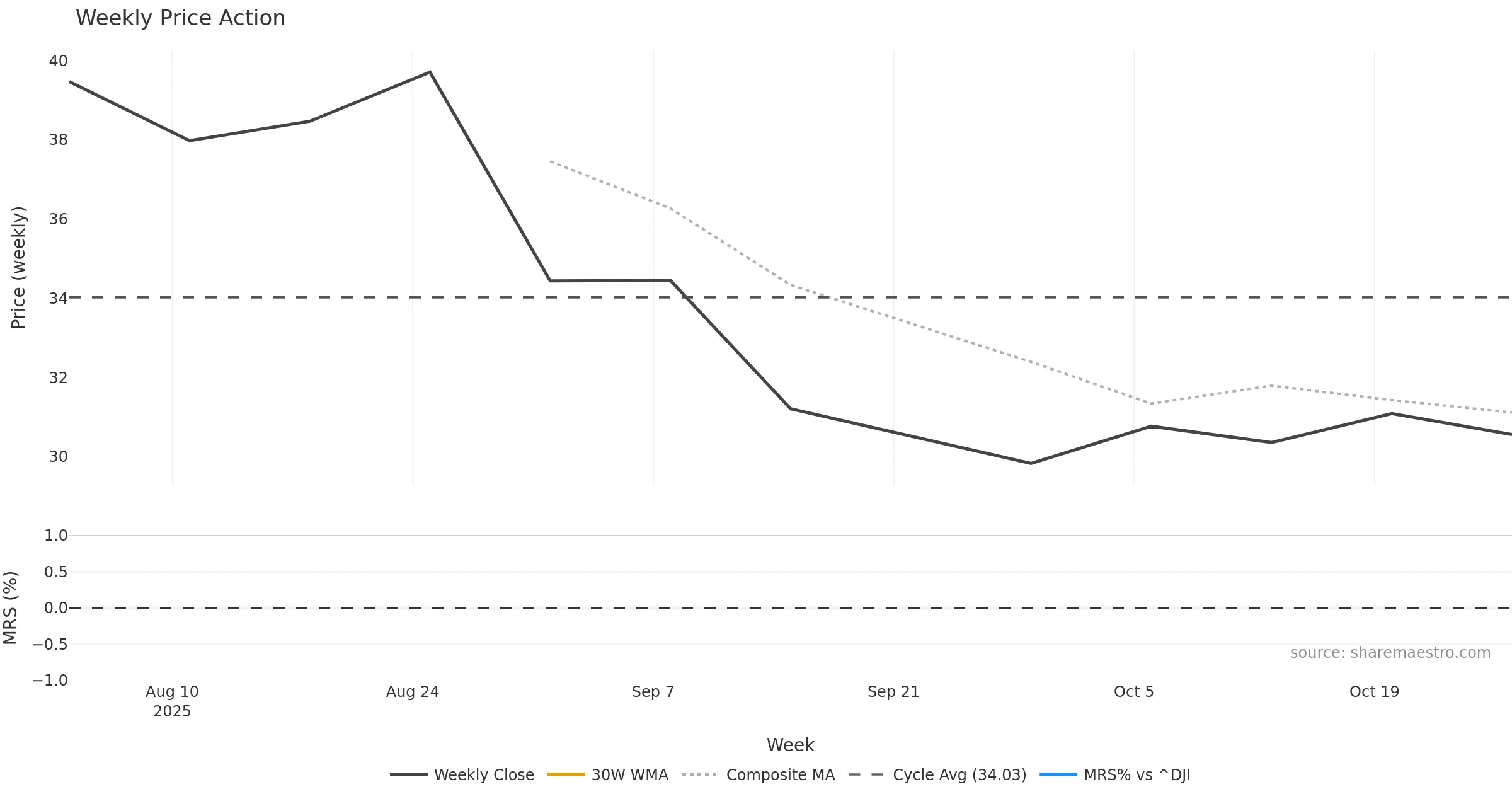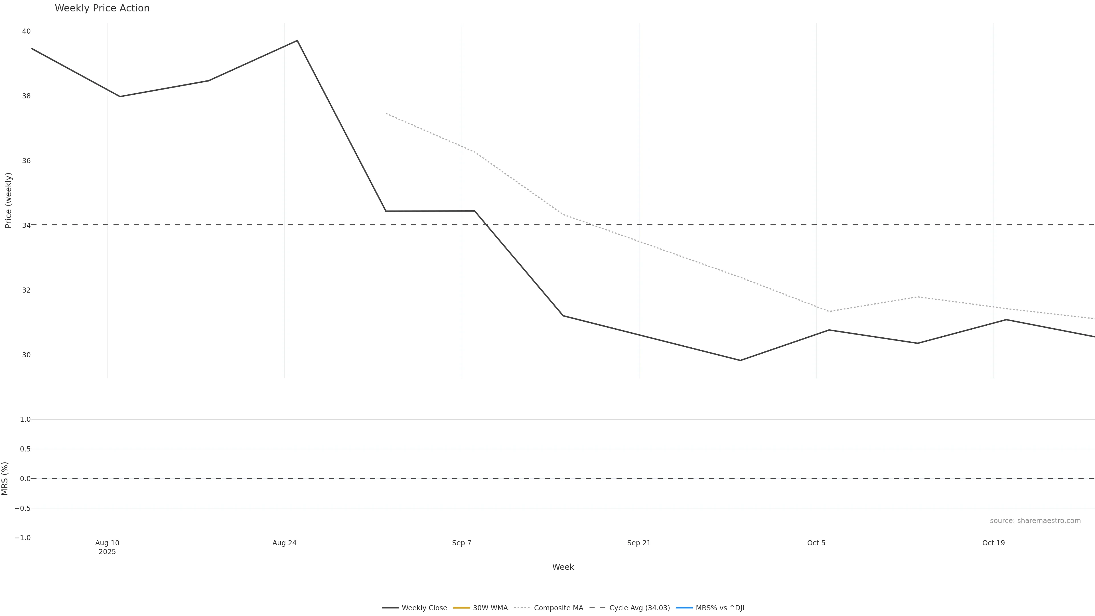 Last week closed down (-2.80%), and over the last 8 weeks price is down (-11.27%) with a falling slope (-1.717%/w). Ranges are compressing (current 0.51× mean; 12th pct; realised vol ≈ 3.97%). Price spends time in the lower band (rising), participation is below typical with a selling-tilt bias (z -4.32), money flow is falling, and posture is below 30w & 50w (drawdown -11.29%). Pressure favours further decline unless momentum repairs.