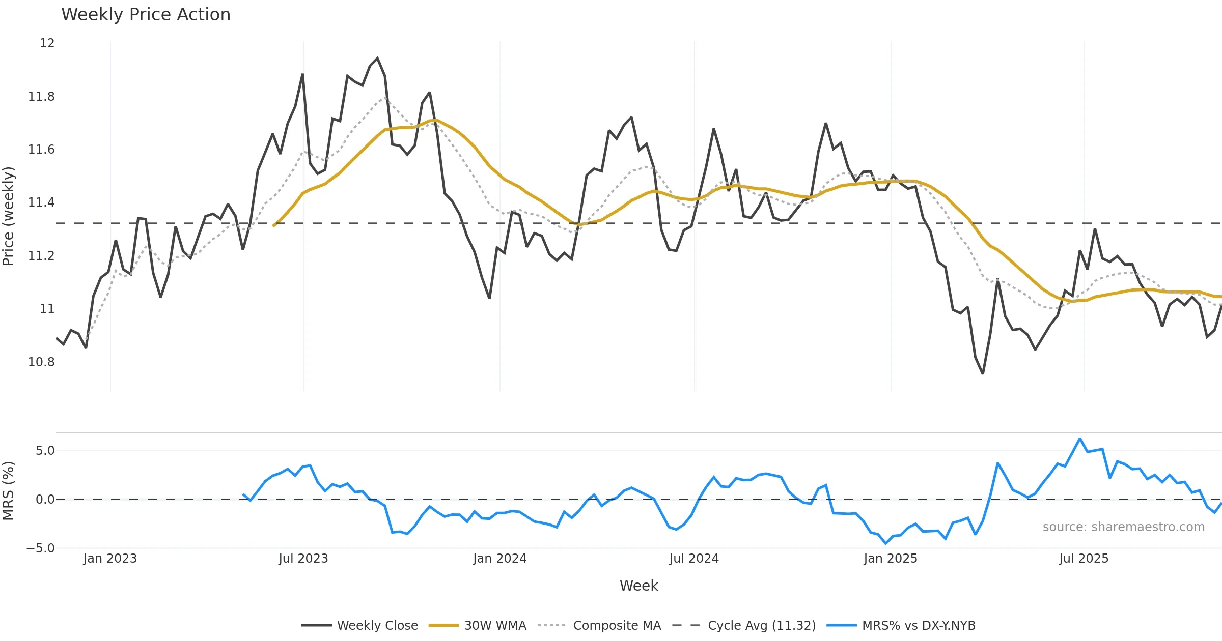 Last week closed down (-0.32%), and over the last 8 weeks price is down (-0.01%) with a falling slope (-0.107%/w). Ranges are compressing (current 0.79× mean; 12th pct; realised vol ≈ 0.57%). Price spends time in the middle band (falling), participation is near typical with a balanced bias (z +0.00), money flow is flat, and posture is below 30w & 50w (drawdown -0.27%). Balance is mixed; watch participation shifts and behaviour at the 30-week average.