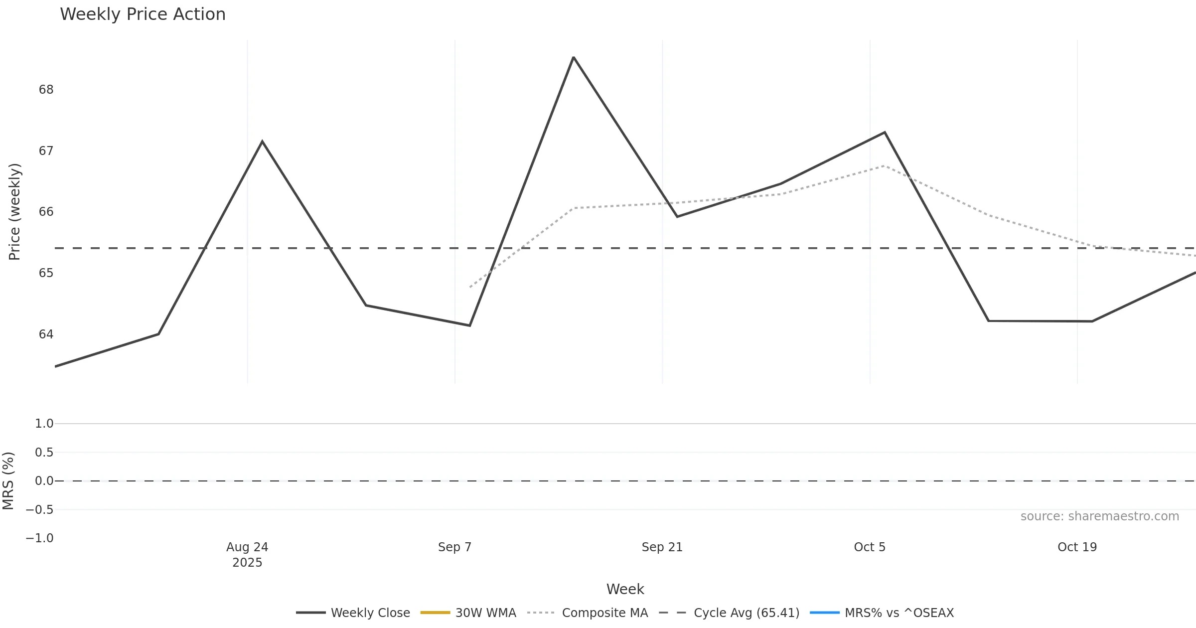 Last week closed up (1.03%), and over the last 8 weeks price is up (1.36%) with a falling slope (-0.358%/w). Ranges are compressing (current 0.60× mean; 38th pct; realised vol ≈ 3.50%). Price spends time in the middle band (falling), participation is below typical with a buying-tilt bias (z -4.04), money flow is rising, and posture is above 30w & 50w (drawdown -5.14%). Balance is mixed; watch participation shifts and behaviour at the 30-week average.