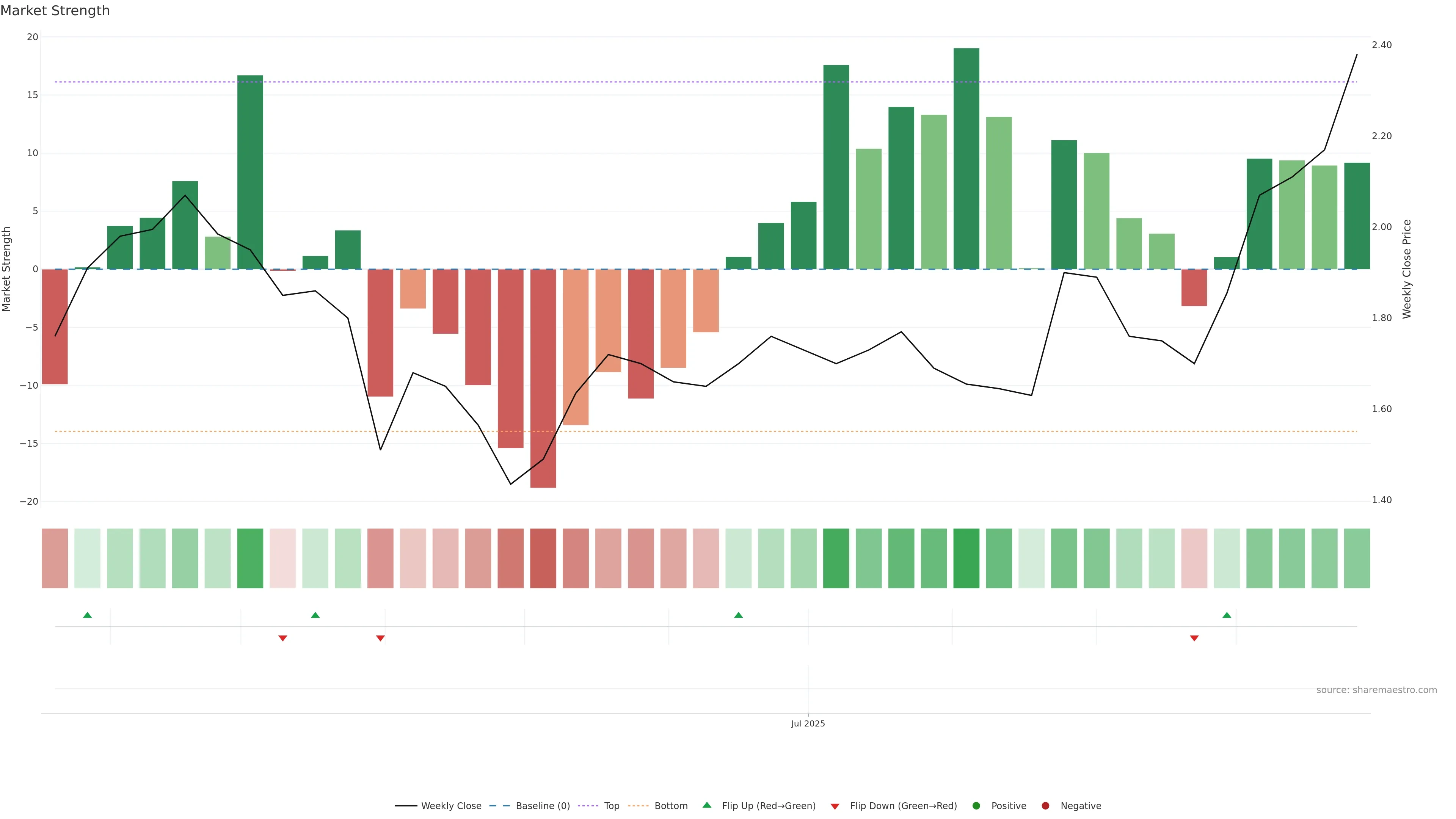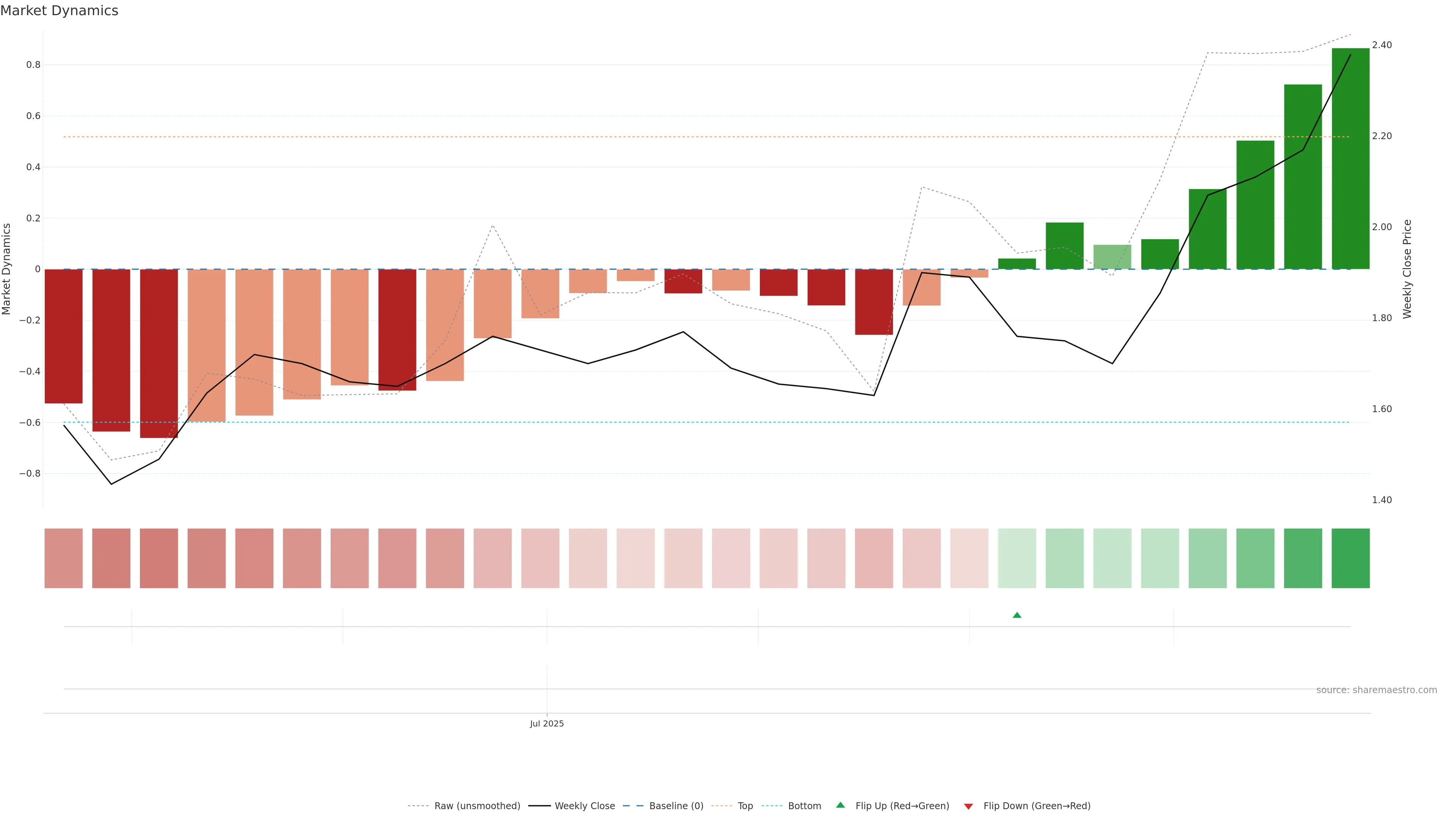 Recent ribbon flip to green. — First bars of a new state can build trend.