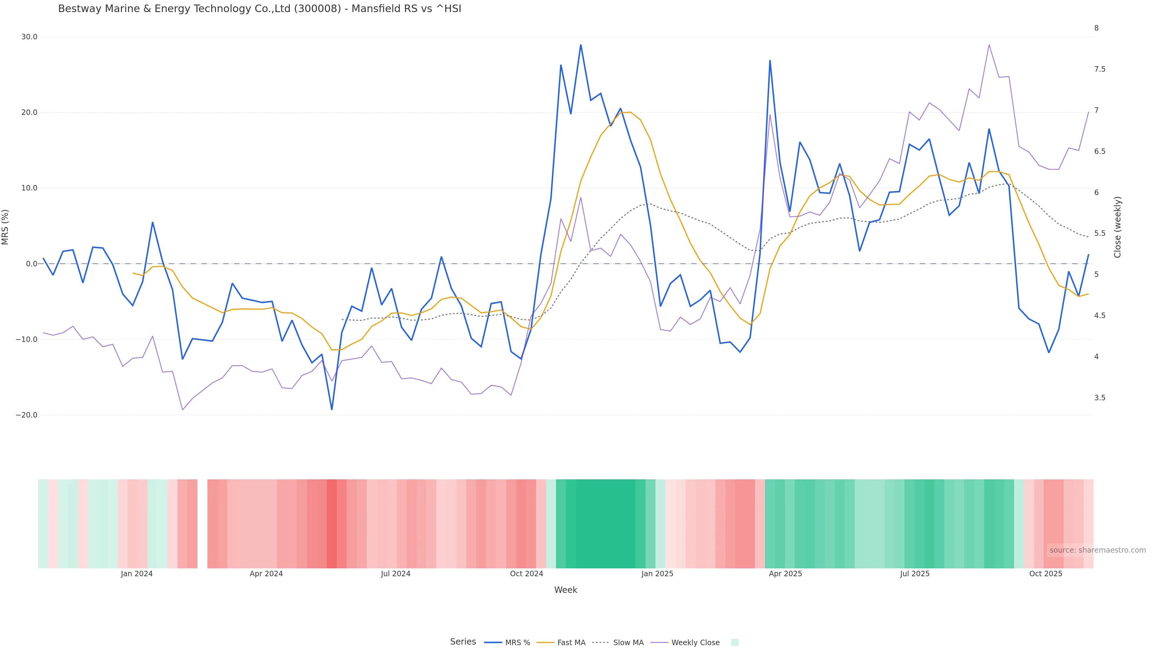 Last week closed up (7.88%), and over the last 8 weeks price is up (6.40%) with a rising slope (0.673%/w). Ranges are expanding (current 3.11× mean; 100th pct; realised vol ≈ 3.19%). Price spends time in the middle band (rising), participation is below typical with a buying-tilt bias (z -2.72), money flow is rising, and posture is above 30w & 50w (drawdown 0.00%). Balance is mixed; watch participation shifts and behaviour at the 30-week average.