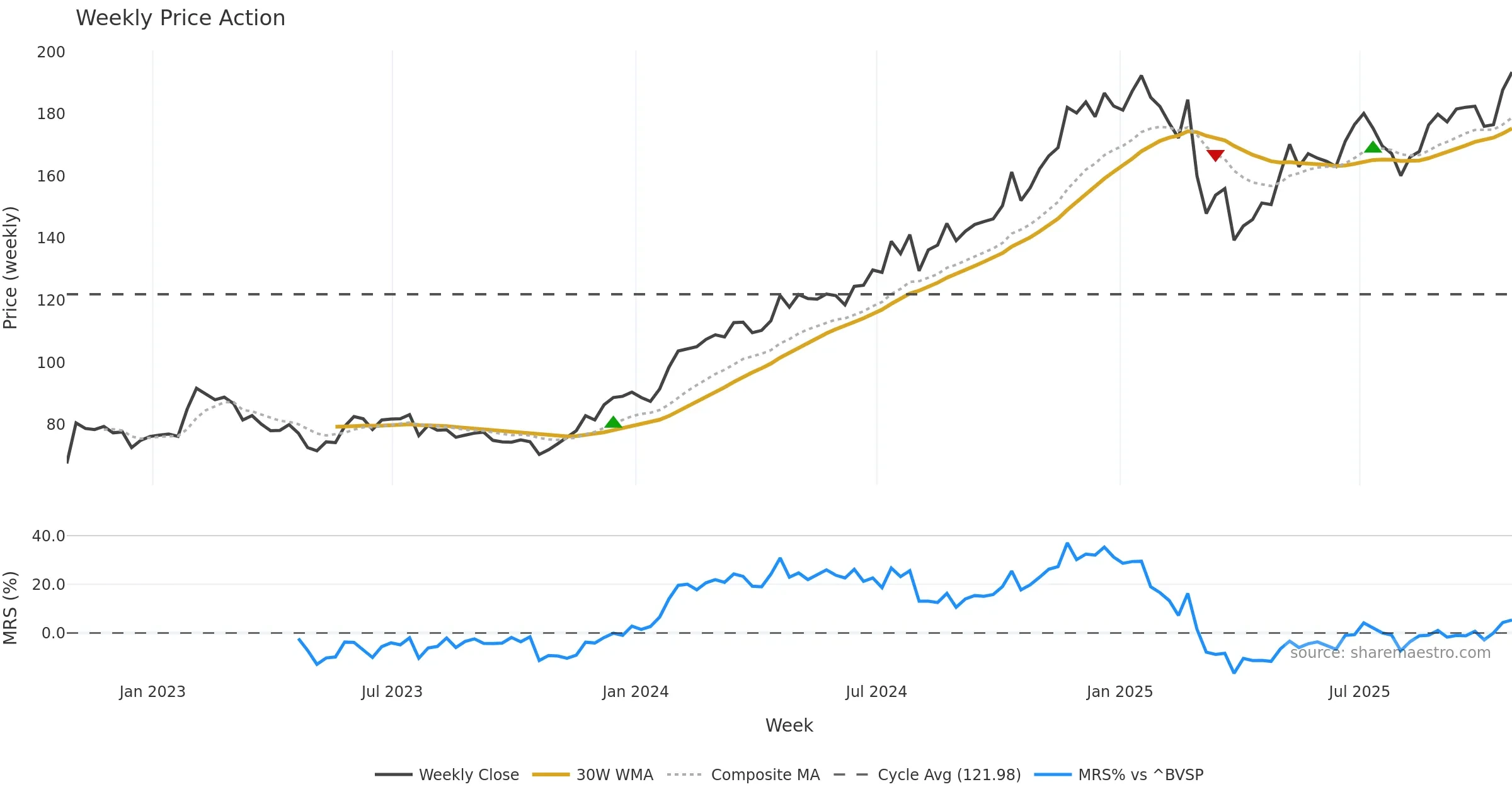 Mansfield RS vs ^BVSP is positive and rising. Outperformance tailwind for swing entries. In essence this reflects Mansfield relative strength trend with a bullish tilt.