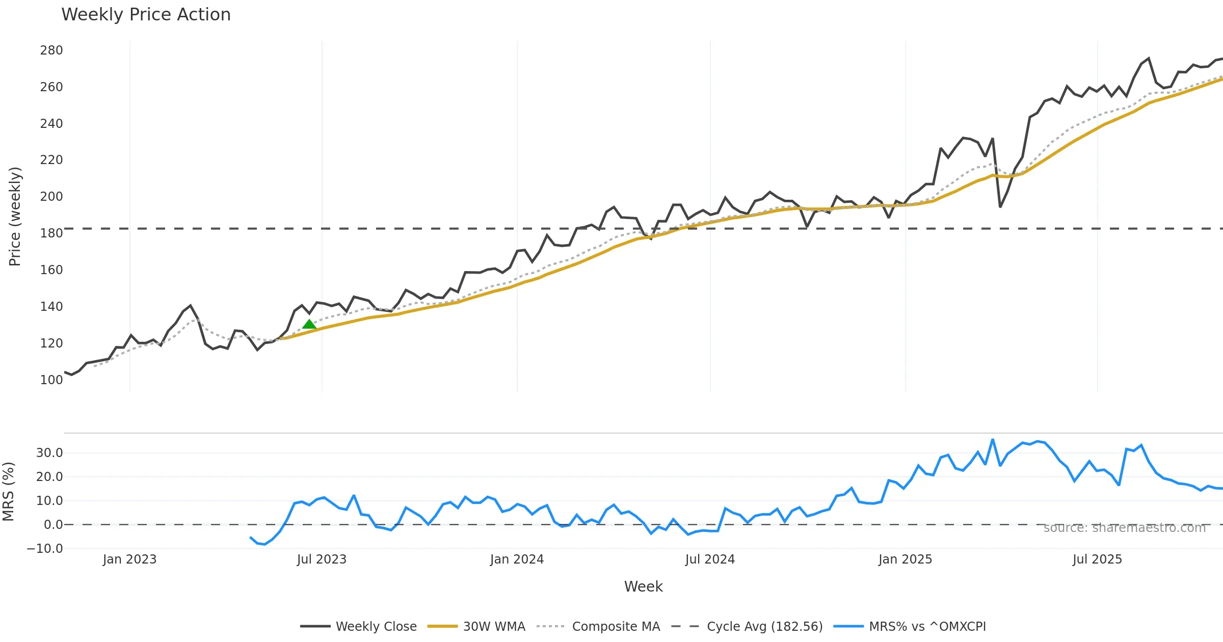 Last week closed up (0.92%), and over the last 8 weeks price is up (5.84%) with a rising slope (0.646%/w). Ranges are expanding (current 0.93× mean; 62th pct; realised vol ≈ 1.14%). Price spends time in the upper band (rising), participation is below typical with a buying-tilt bias (z -2.65), money flow is rising, and posture is above 30w & 50w (drawdown 0.00%). Balance is mixed; watch participation shifts and behaviour at the 30-week average.