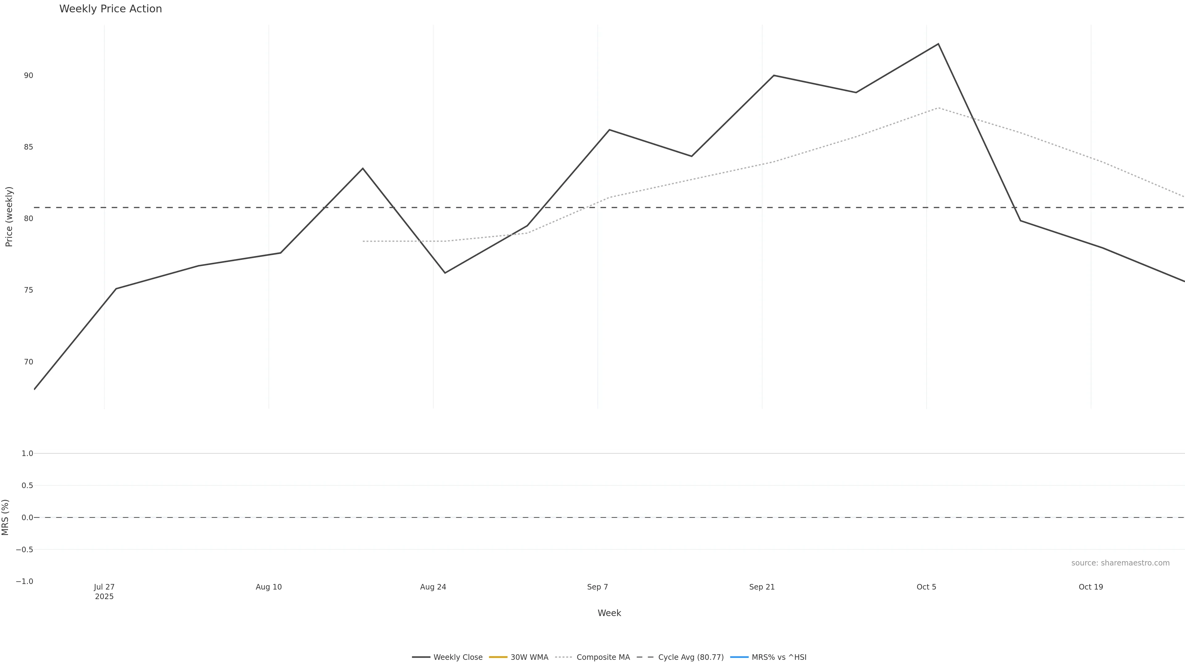 Last week closed down (-3.88%), and over the last 8 weeks price is down (-12.30%) with a falling slope (-1.880%/w). Ranges are expanding (current 1.43× mean; 88th pct; realised vol ≈ 5.86%). Price spends time in the middle band (falling), participation is below typical with a selling-tilt bias (z -0.93), money flow is falling, and posture is above 30w & 50w (drawdown -18.00%). Pressure favours further decline unless momentum repairs.
