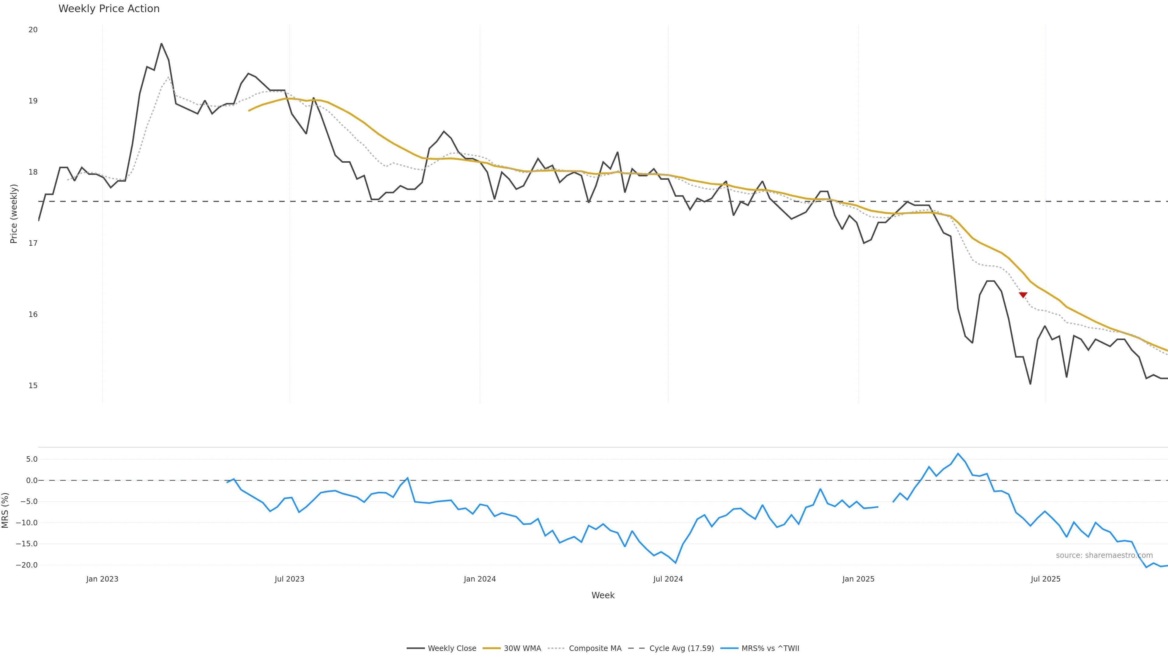 Last week closed down (-1.31%), and over the last 8 weeks price is down (-3.51%) with a falling slope (-0.617%/w). Ranges are expanding (current 1.33× mean; 88th pct; realised vol ≈ 0.71%). Price spends time in the lower band (falling), participation is below typical with a balanced bias (z -3.35), money flow is rising, and posture is below 30w & 50w (drawdown -3.51%). Balance is mixed; watch participation shifts and behaviour at the 30-week average.