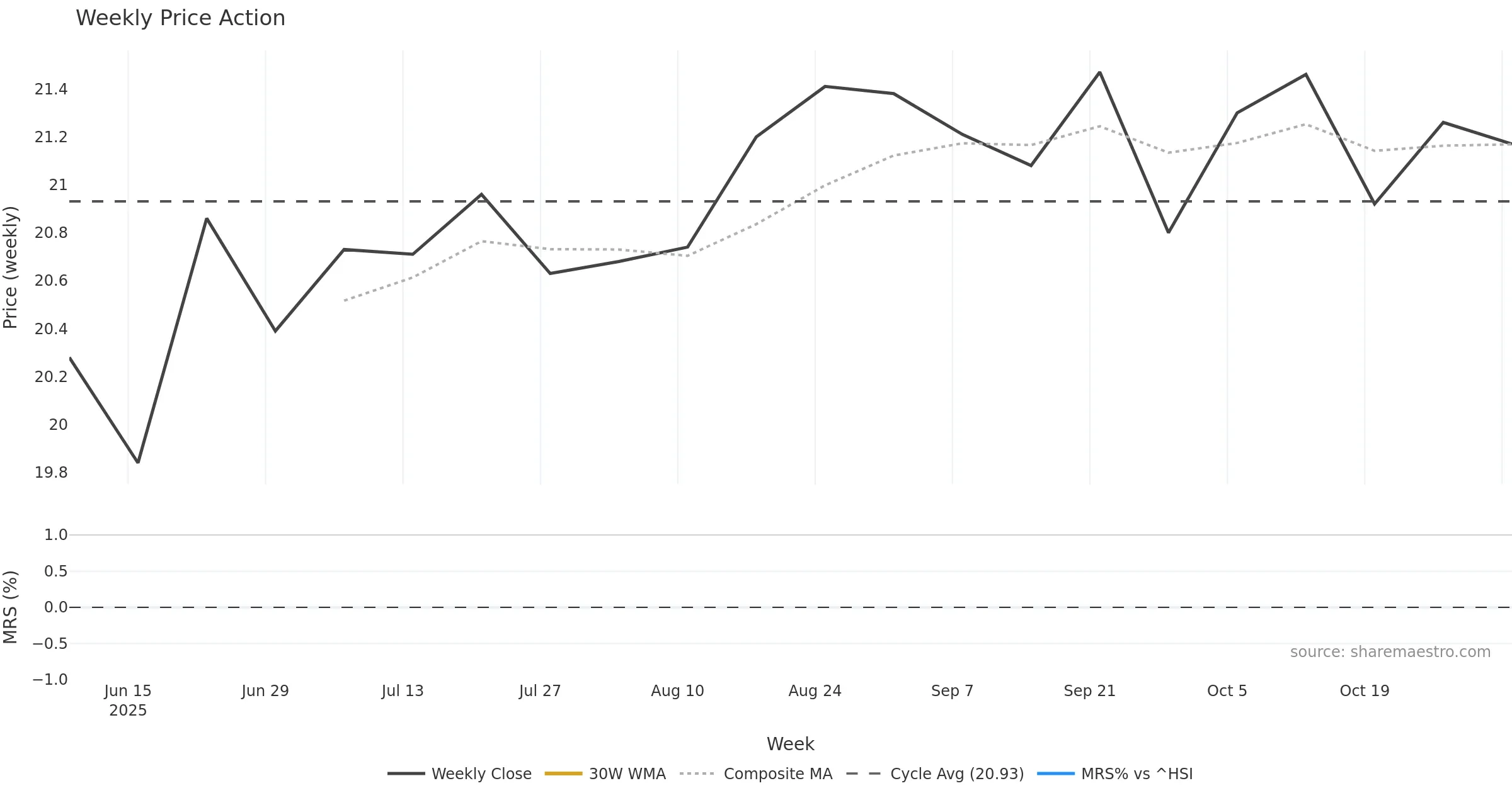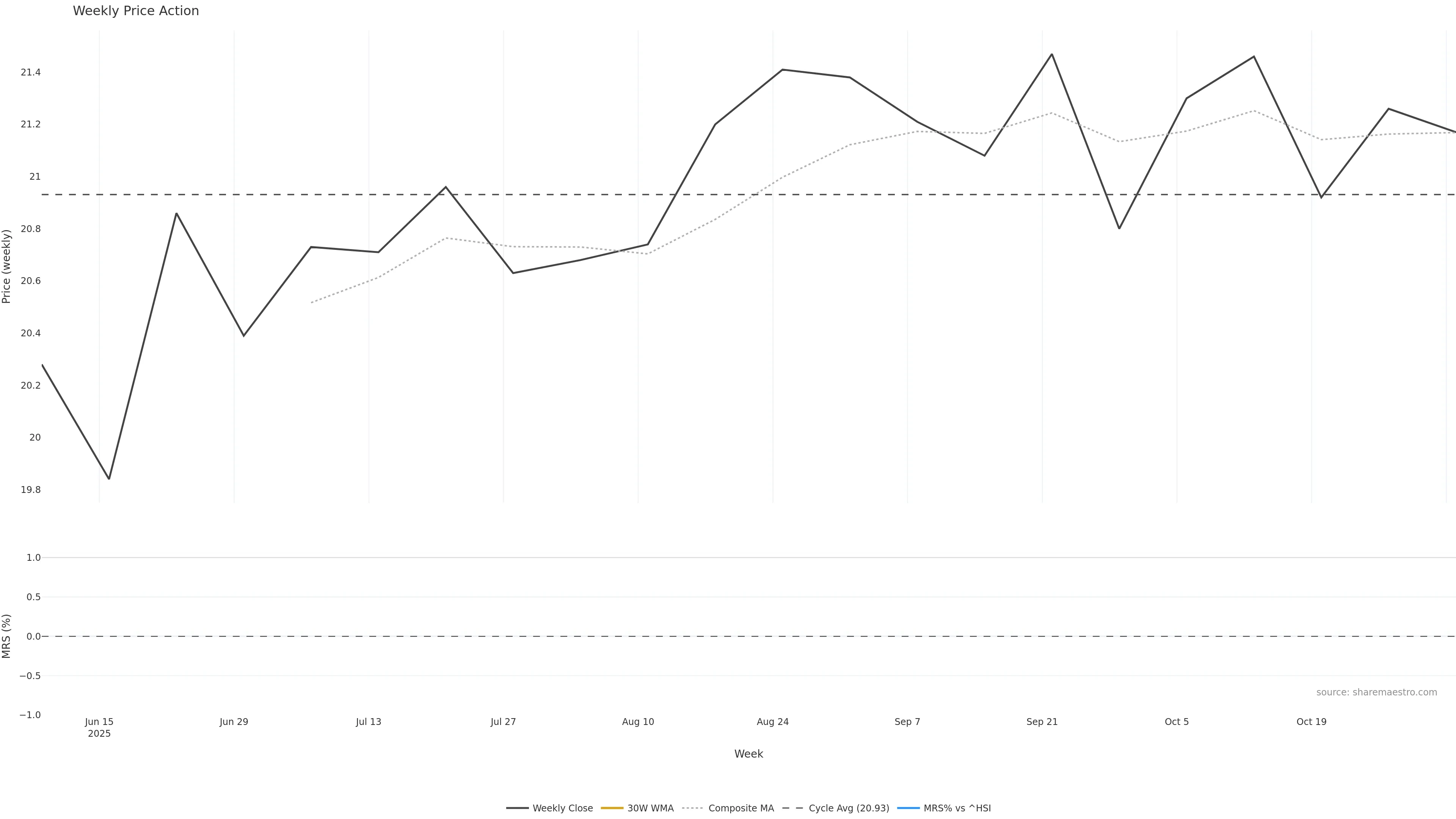 Last week closed up (0.14%), and over the last 8 weeks price is up (0.24%) with a rising slope (0.001%/w). Ranges are expanding (current 0.35× mean; 12th pct; realised vol ≈ 2.03%). Price spends time in the upper band (falling), participation is below typical with a buying-tilt bias (z -4.78), money flow is rising, and posture is above 30w & 50w (drawdown -0.98%). Balance is mixed; watch participation shifts and behaviour at the 30-week average.