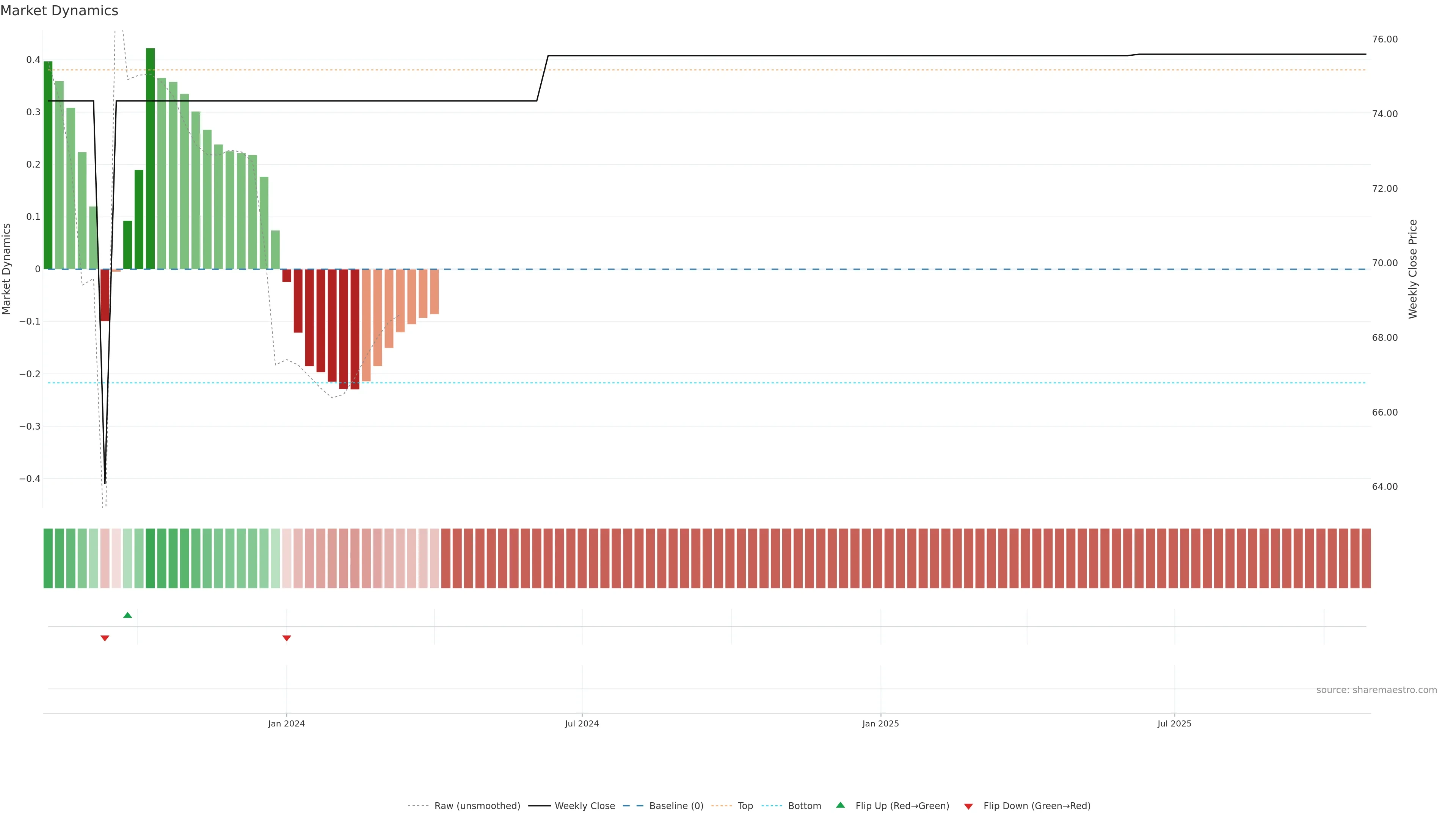 Price and Dynamics disagree (tug-of-war). Wait for resolution or use smaller sizing. In essence this reflects alignment between price and strength/intent with a bearish tilt.