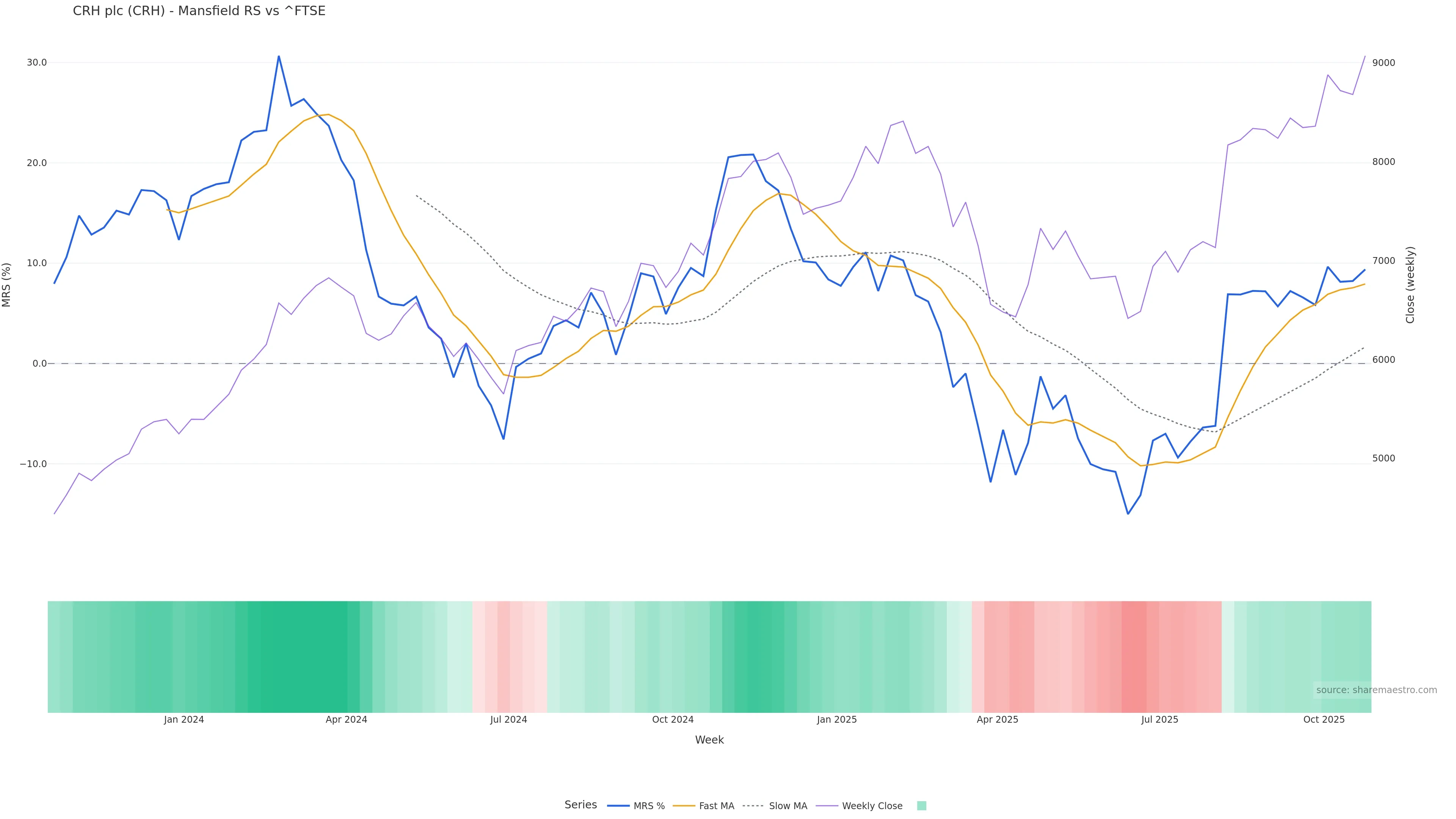 Last week closed up (2.62%), and over the last 8 weeks price is up (10.12%) with a rising slope (1.201%/w). Ranges are expanding (current 1.39× mean; 88th pct; realised vol ≈ 2.82%). Price spends time in the upper band (falling), participation is below typical with a selling-tilt bias (z -1.60), money flow is rising, and posture is above 30w & 50w (drawdown 0.00%). Balance is mixed; watch participation shifts and behaviour at the 30-week average.