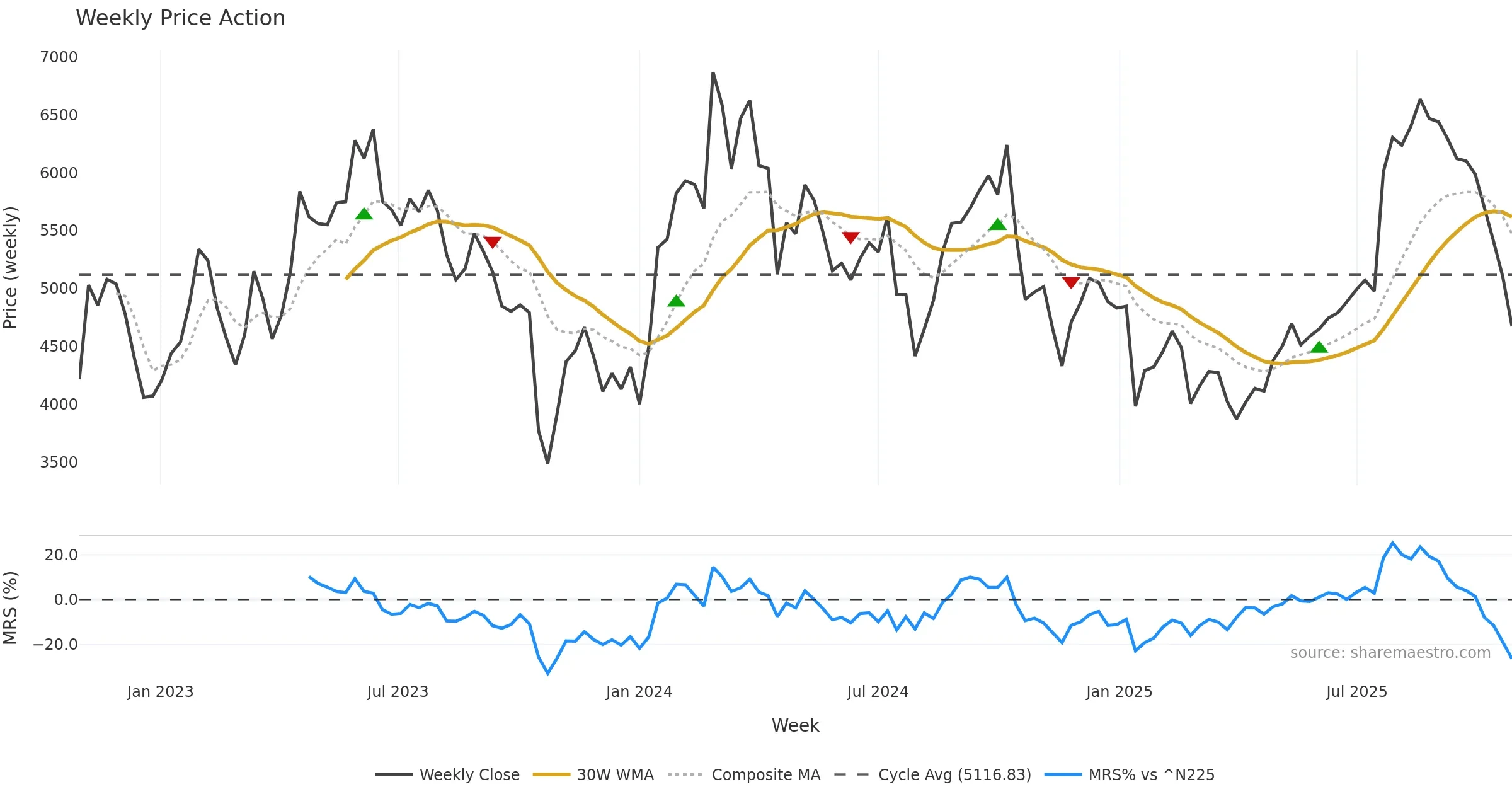 Mansfield RS vs ^N225 is negative and weakening. Avoid unless a reversal forms. In essence this reflects Mansfield relative strength trend with a bearish tilt.