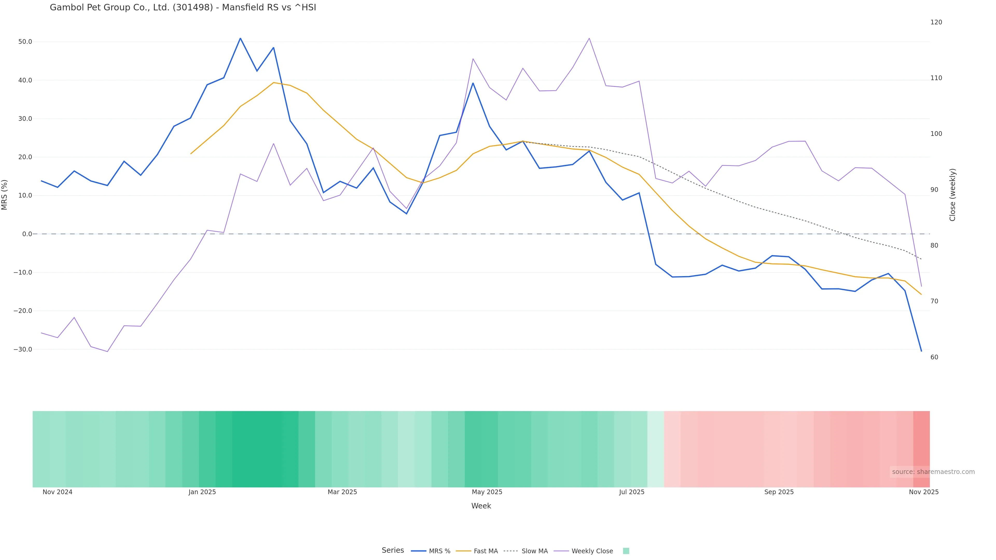 Last week closed up (0.76%), and over the last 8 weeks price is down (-26.40%) with a falling slope (-2.677%/w). Ranges are expanding (current 0.79× mean; 25th pct; realised vol ≈ 6.33%). Price spends time in the lower band (falling), participation is above typical with a buying-tilt bias (z +0.64), money flow is falling, and posture is below 30w & 50w (drawdown -26.40%). Pressure favours further decline unless momentum repairs.