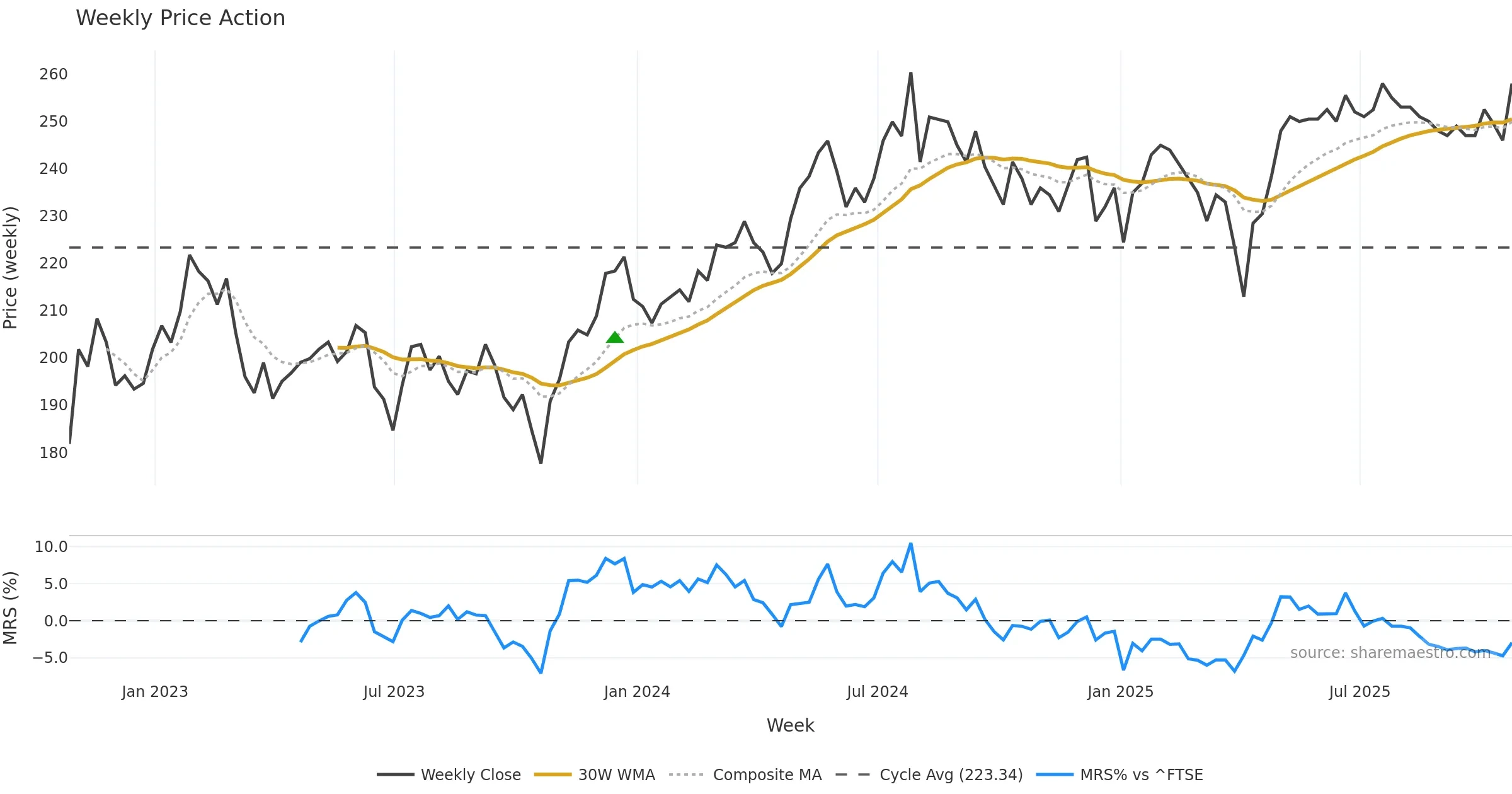 Last week closed up (1.18%), and over the last 8 weeks price is up (4.45%) with a rising slope (0.358%/w). Ranges are expanding (current 1.12× mean; 75th pct; realised vol ≈ 2.09%). Price spends time in the upper band (rising), participation is below typical with a buying-tilt bias (z -3.25), money flow is falling, and posture is above 30w & 50w (drawdown 0.00%). Balance is mixed; watch participation shifts and behaviour at the 30-week average.