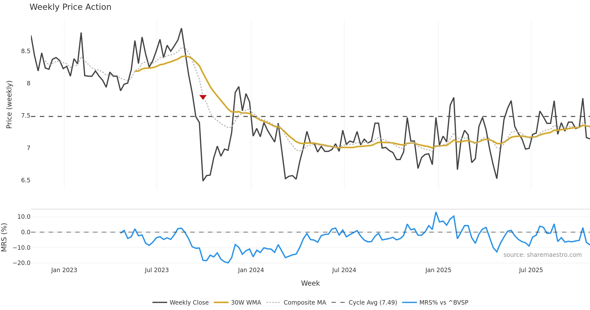 Last week closed down (-0.42%), and over the last 8 weeks price is down (-1.65%) with a falling slope (-0.148%/w). Ranges are expanding (current 0.03× mean; 62th pct; realised vol ≈ 3.87%). Price spends time in the lower band (falling), participation is below typical with a selling-tilt bias (z -3.85), money flow is rising, and posture is below 30w & 50w (drawdown -8.11%). Balance is mixed; watch participation shifts and behaviour at the 30-week average.