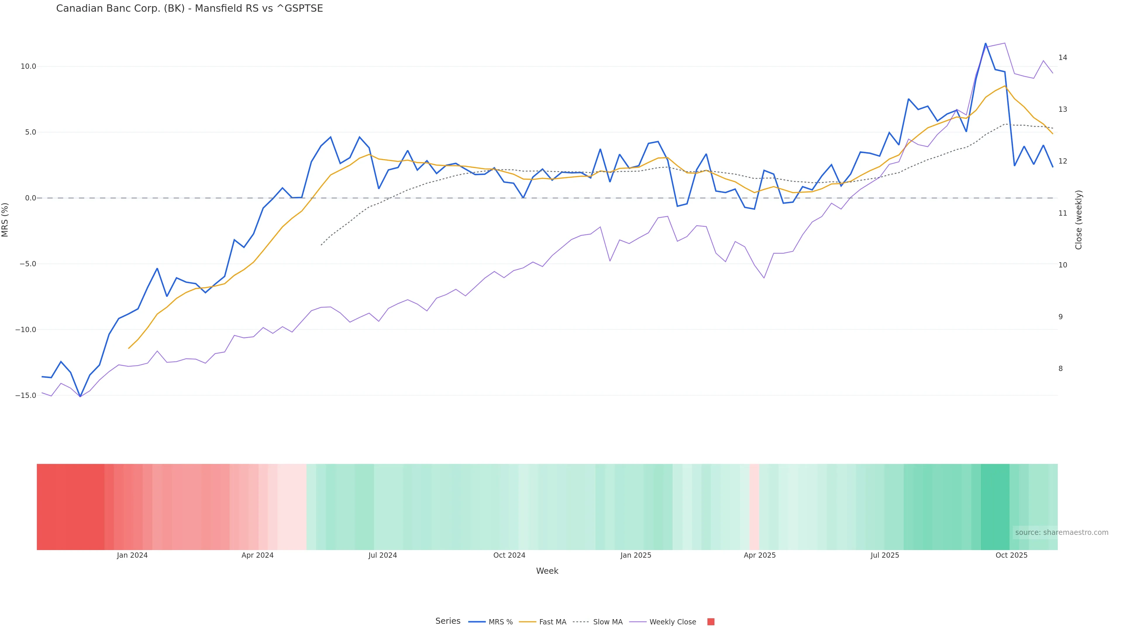 %B slope is the weekly drift of %B — rising means price is gravitating toward strength.