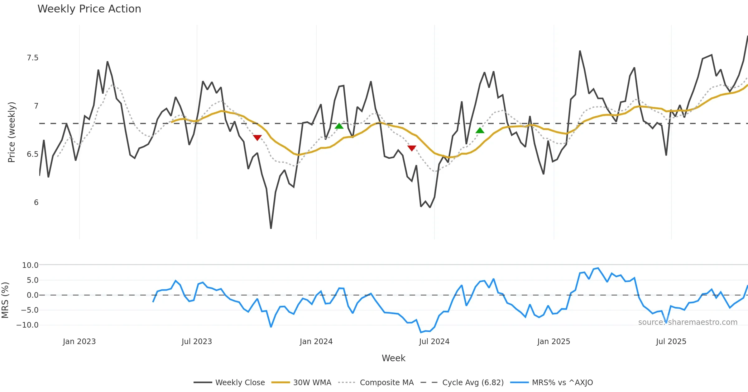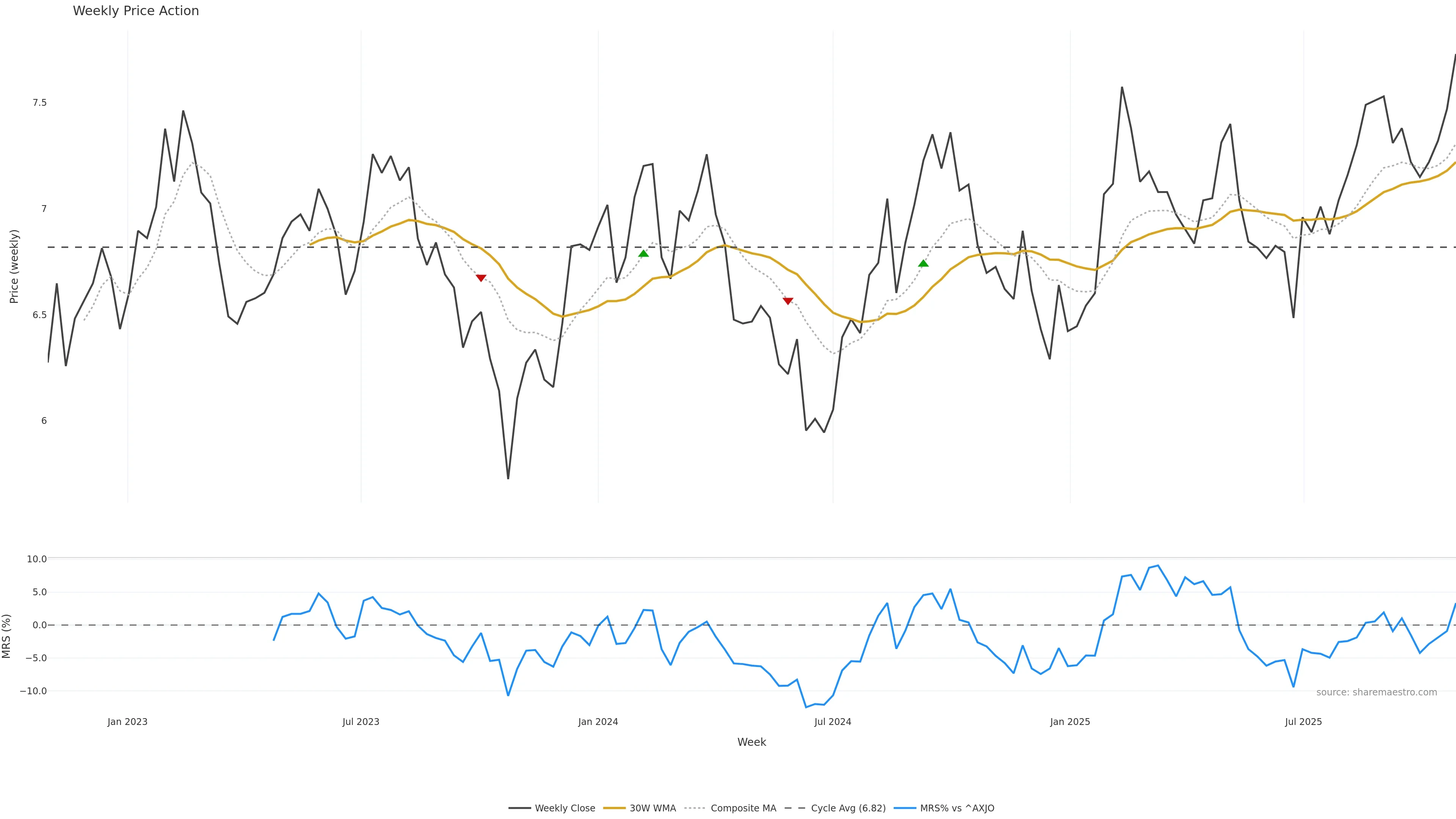 Last week closed up (0.65%), and over the last 8 weeks price is up (5.75%) with a rising slope (0.609%/w). Ranges are expanding (current 0.96× mean; 50th pct; realised vol ≈ 1.74%). Price spends time in the upper band (rising), participation is below typical with a buying-tilt bias (z -2.57), money flow is rising, and posture is above 30w & 50w (drawdown 0.00%). Balance is mixed; watch participation shifts and behaviour at the 30-week average.