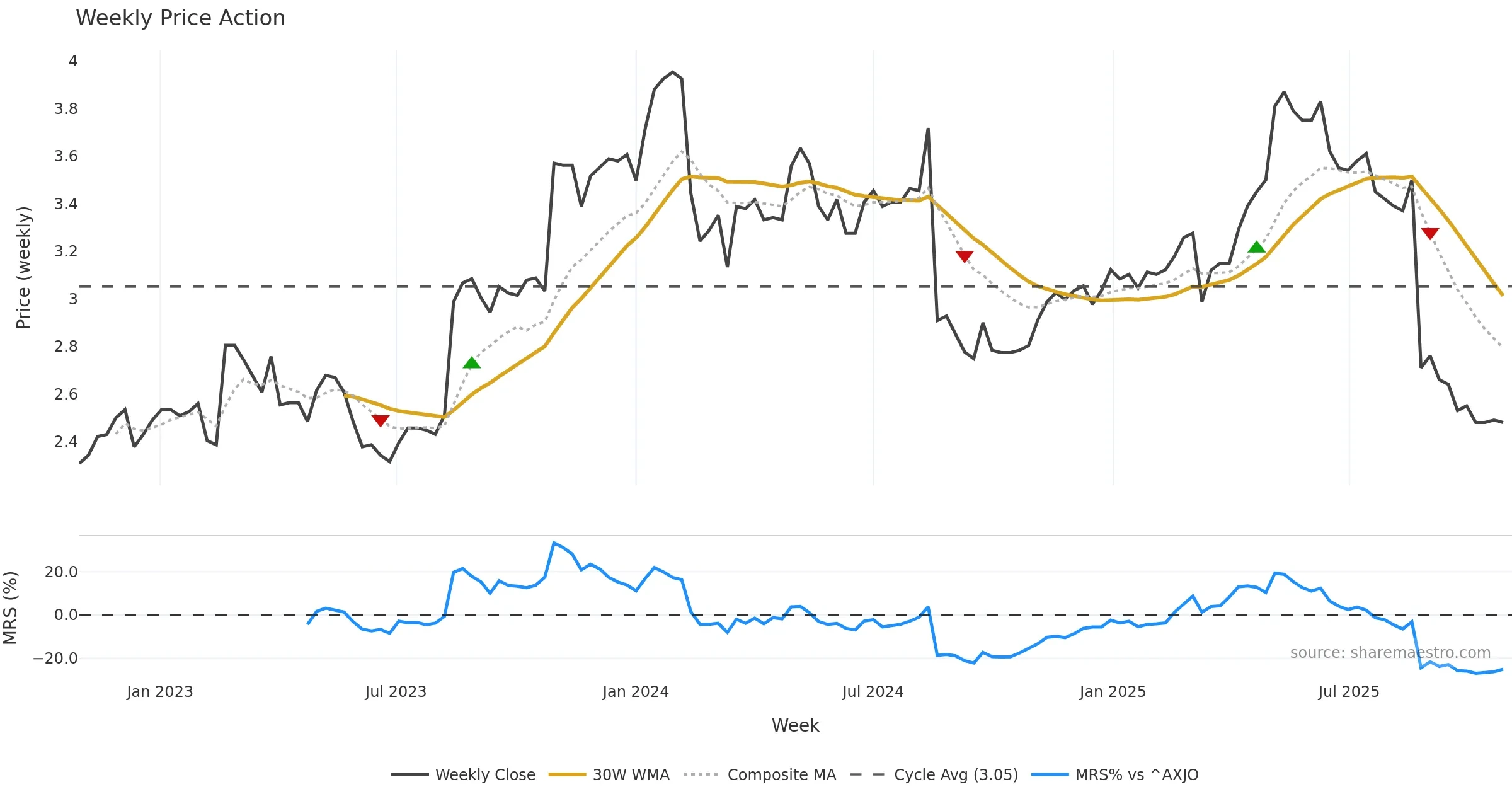 Mansfield RS vs ^AXJO is negative and weakening. Avoid unless a reversal forms. In essence this reflects Mansfield relative strength trend with a bearish tilt.