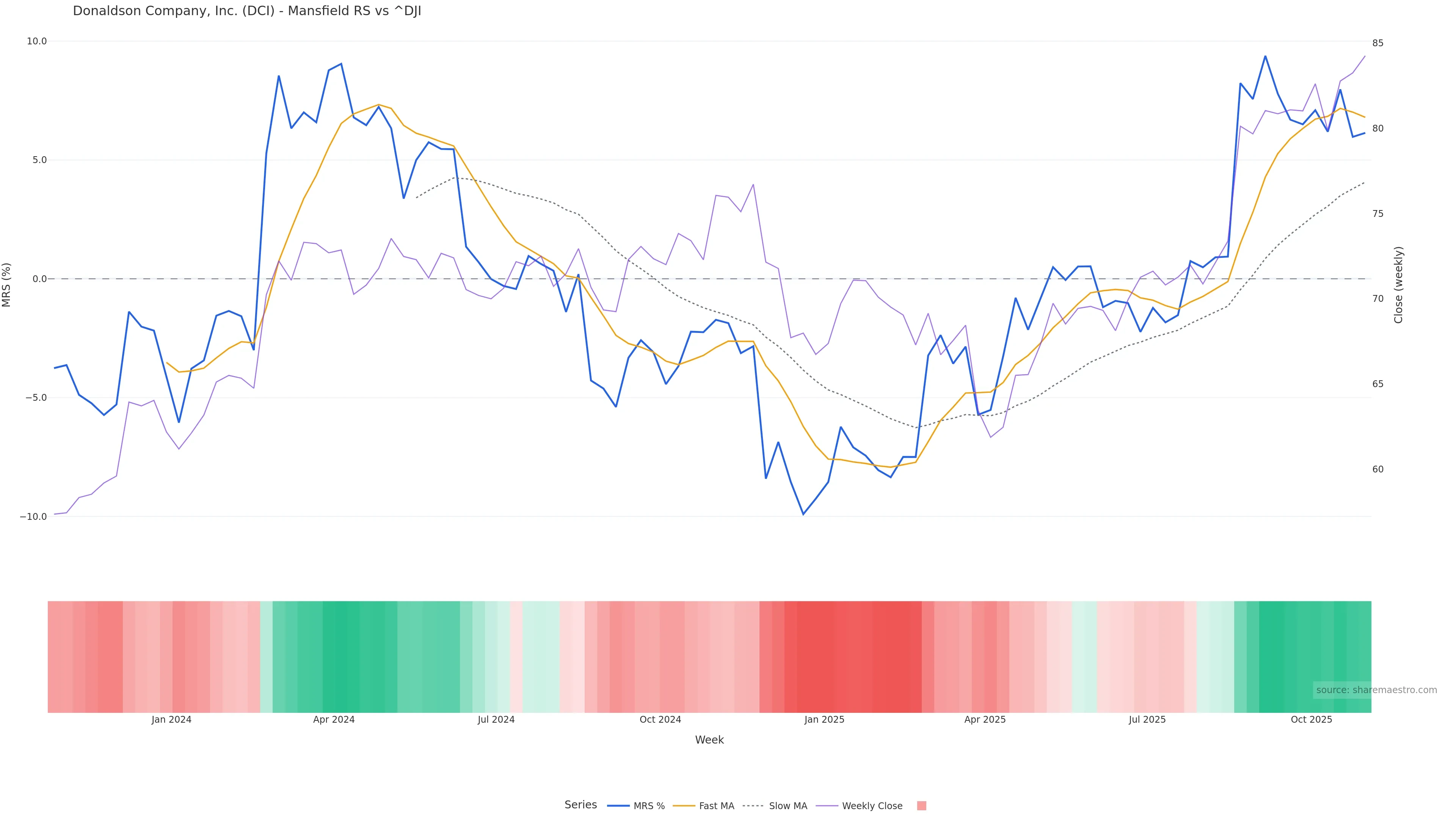 Last week closed up (0.74%), and over the last 8 weeks price is up (4.21%) with a rising slope (0.540%/w). Ranges are expanding (current 0.97× mean; 62th pct; realised vol ≈ 1.97%). Price spends time in the upper band (falling), participation is below typical with a selling-tilt bias (z -2.42), money flow is rising, and posture is above 30w & 50w (drawdown 0.00%). Balance is mixed; watch participation shifts and behaviour at the 30-week average.