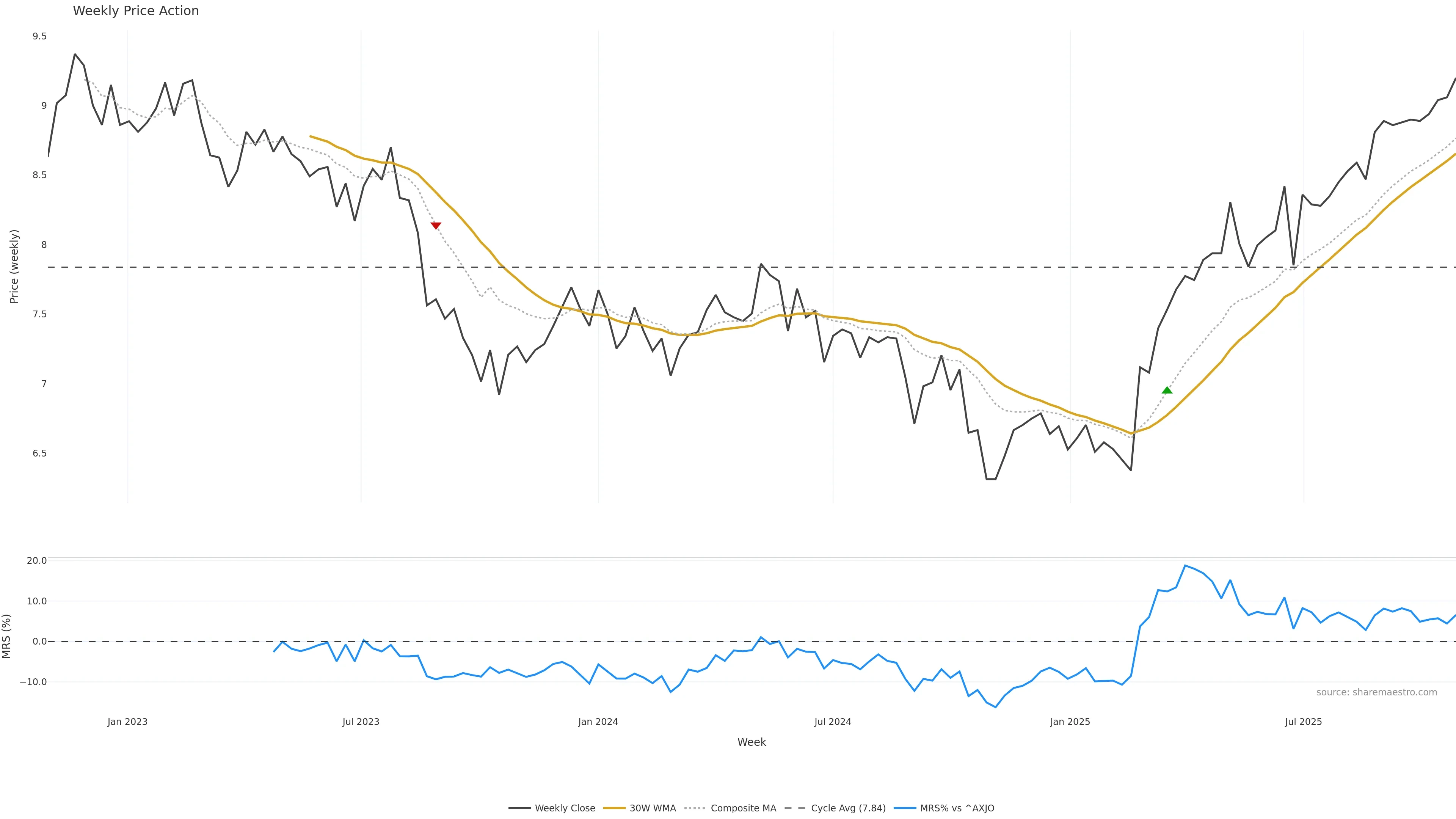 Last week closed up (0.55%), and over the last 8 weeks price is up (3.84%) with a rising slope (0.498%/w). Ranges are expanding (current 1.26× mean; 88th pct; realised vol ≈ 0.54%). Price spends time in the upper band (falling), participation is below typical with a buying-tilt bias (z -2.35), money flow is rising, and posture is above 30w & 50w (drawdown 0.00%). Balance is mixed; watch participation shifts and behaviour at the 30-week average.