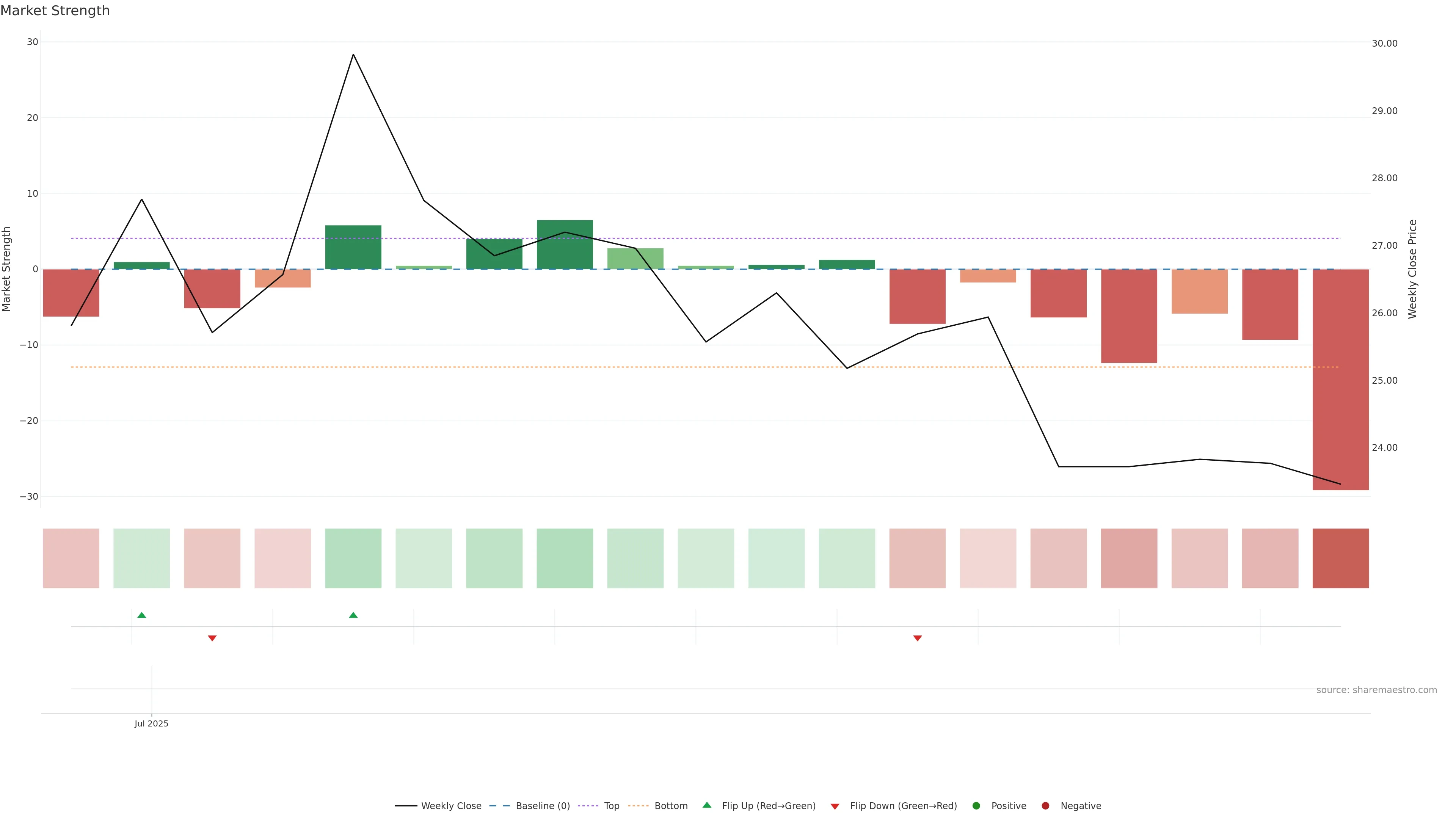 Last week closed down (-0.09%), and over the last 8 weeks price is down (-6.83%) with a falling slope (-1.364%/w). Ranges are compressing (current 0.58× mean; 12th pct; realised vol ≈ 3.25%). Price spends time in the lower band (falling), participation is below typical with a selling-tilt bias (z -2.70), money flow is rising, and posture is below 30w & 50w (drawdown -9.56%). Balance is mixed; watch participation shifts and behaviour at the 30-week average.