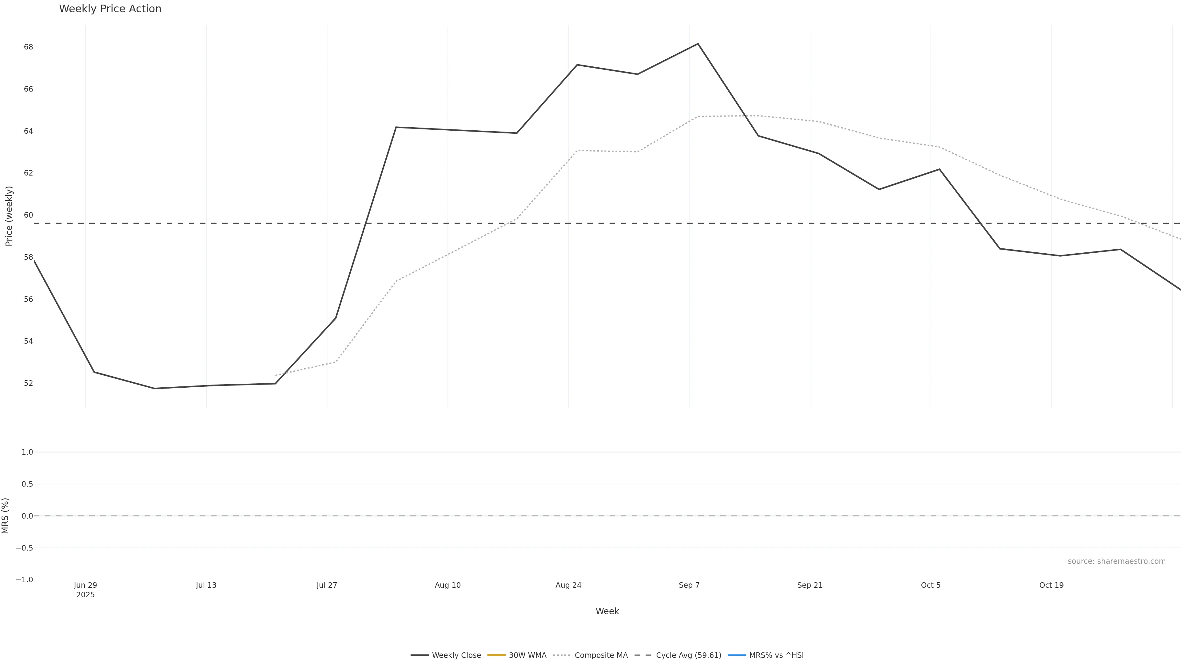 Last week closed down (-2.23%), and over the last 8 weeks price is down (-14.35%) with a falling slope (-2.118%/w). Ranges are compressing (current 1.05× mean; 50th pct; realised vol ≈ 2.88%). Price spends time in the middle band (falling), participation is below typical with a selling-tilt bias (z -1.71), money flow is falling, and posture is below 30w & 50w (drawdown -14.35%). Pressure favours further decline unless momentum repairs.