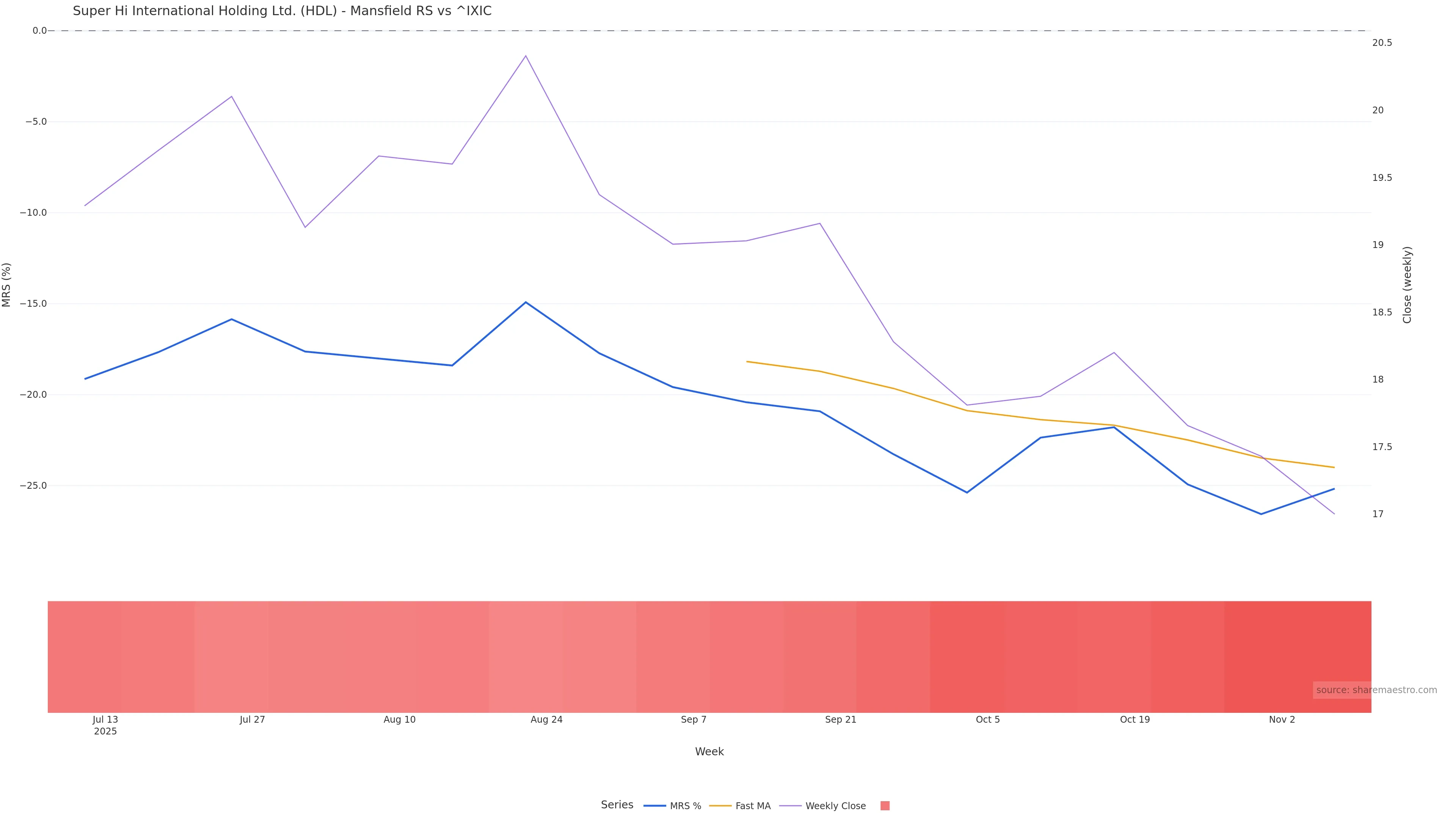 Last week closed down (-2.47%), and over the last 8 weeks price is down (-11.27%) with a falling slope (-1.295%/w). Ranges are expanding (current 1.45× mean; 100th pct; realised vol ≈ 2.00%). Price spends time in the lower band (falling), participation is below typical with a selling-tilt bias (z -4.42), money flow is falling, and posture is below 30w & 50w (drawdown -11.27%). Pressure favours further decline unless momentum repairs.