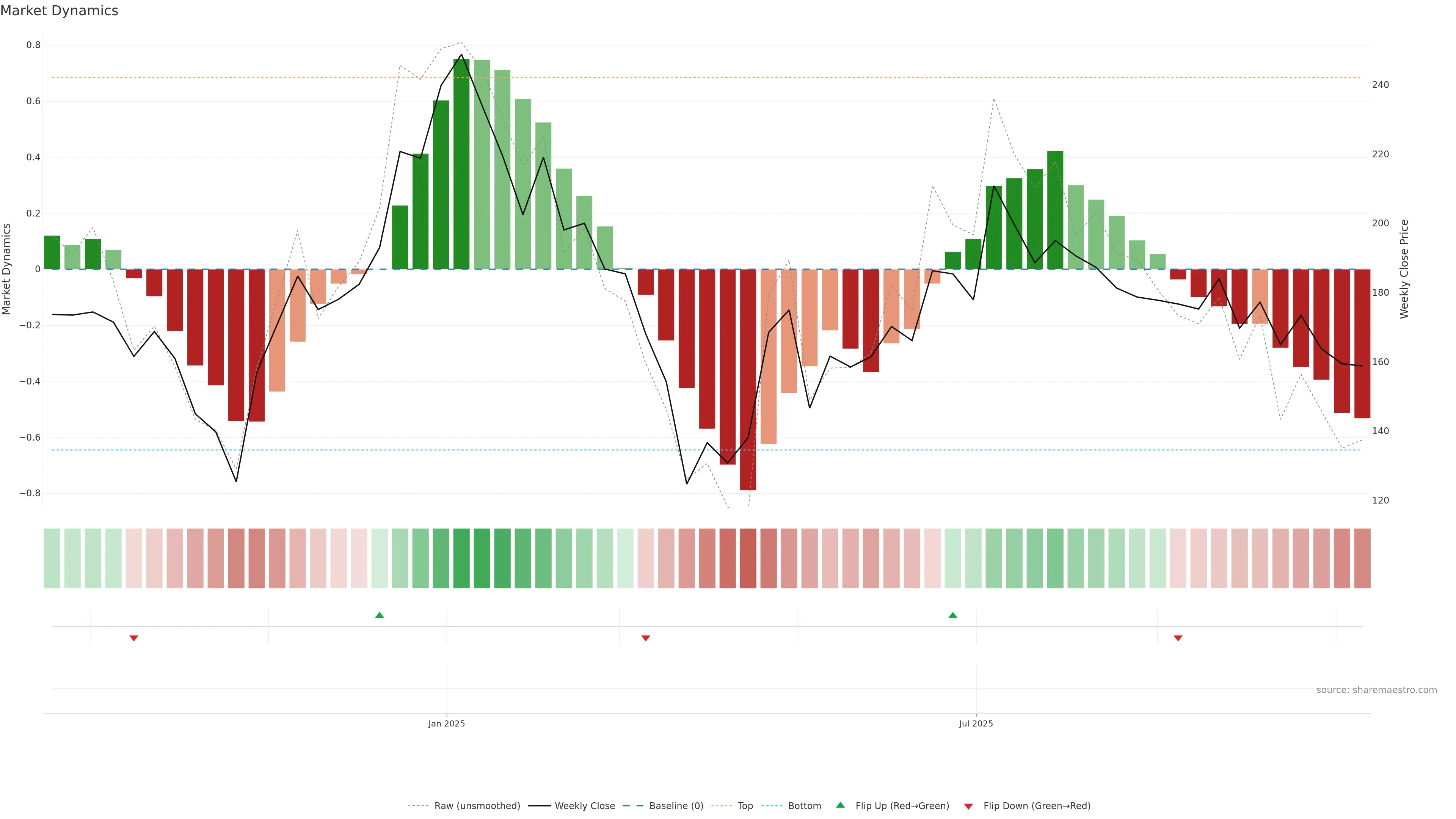 Price and Dynamics are aligned to the downside. — Downtrend alignment increases failure risk of bounces.